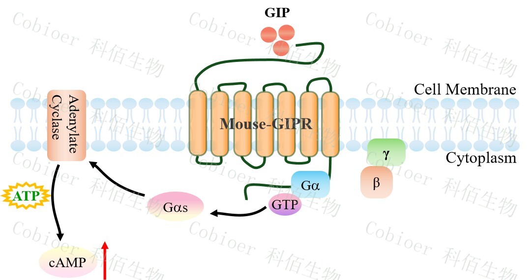 cAMP 在 G 蛋白偶聯(lián)受體(GPCR)信號(hào)轉(zhuǎn)導(dǎo)中是一種關(guān)鍵的第二信使。當(dāng)配體結(jié)合 到 GPCR,構(gòu)象發(fā)生變化,激活受體接著激活 G 蛋白,Gs 的激活導(dǎo)致腺苷酸環(huán)化酶調(diào)控 cAMP 的升高。Mouse GIPR CHO 藥靶模型很好的模擬了體內(nèi) GIPR 的信號(hào)轉(zhuǎn)導(dǎo)過程,原理 見下圖所示。![]() Figure 1. Mouse GIPR CHO 細(xì)胞模型原理圖
