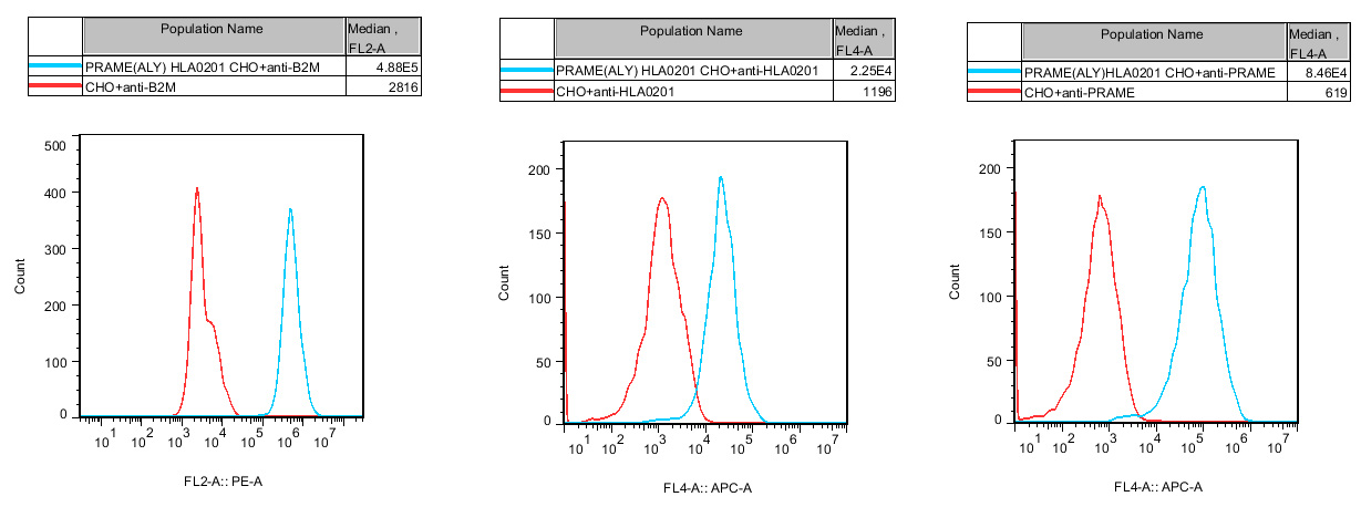 IV. Representative Data![]() Figure 1. Recombinant PRAME(ALY) HLA0201 CHO stably expressing B2M &PRAME & HLA0201.  |