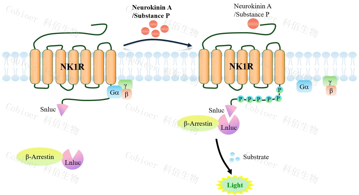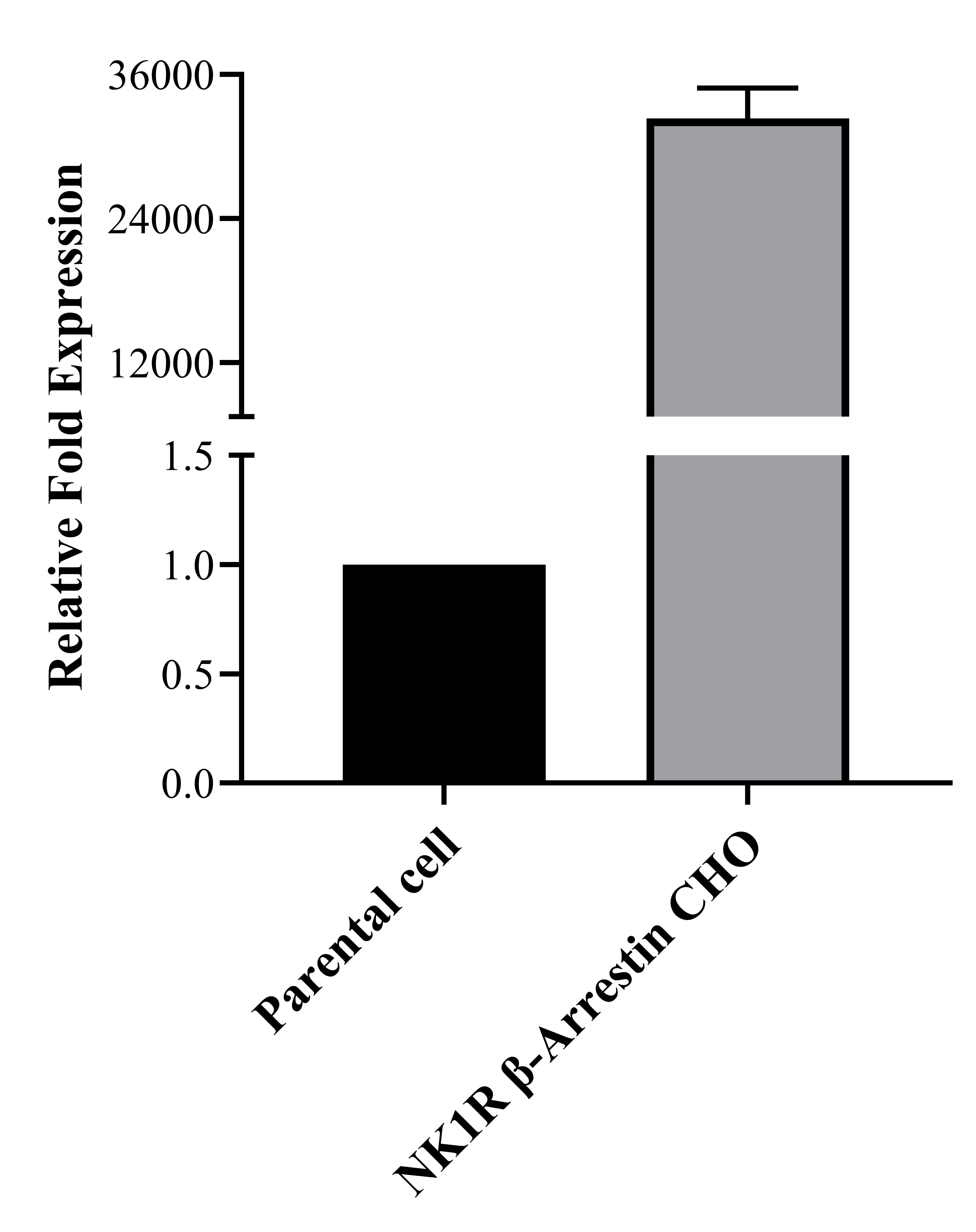 NK1R β-Arrestin CHO 報告基因藥靶模型很好的模擬了體內(nèi) NK1R/β-Arrestin 的信號轉(zhuǎn) 導(dǎo)過程,原理見下圖所示。當(dāng)缺乏配體刺激時,β-Arrestin 不與 NK1R 結(jié)合,融合β-Arrestin的熒光素酶處于失活構(gòu)象,當(dāng) NK1R 遭遇配體刺激時,融合熒光素酶報告基因的β-Arrestin 被招募,使熒光素酶報告基因處于激活狀態(tài),加入其底物后發(fā)光信號增強(qiáng)。![]() Figure 1. NK1R β-Arrestin CHO 細(xì)胞模型原理圖  |
