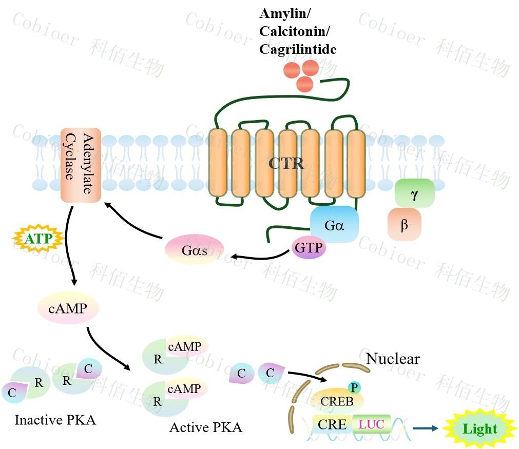 CTR CRE-Luc CHO 報(bào)告基因藥靶模型很好的模擬了體內(nèi) CTR 的信號(hào)轉(zhuǎn)導(dǎo)過(guò)程,原理見(jiàn)下圖所示。![]() Figure 1. CTR CRE-Luc CHO 細(xì)胞模型原理圖  |