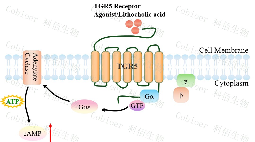 | TGR5 受體是第一個已知的膽汁酸特異性 G 蛋白偶聯(lián)受體,也被稱為膽汁酸受體 1(GPBAR1),屬于 A 類 GPCR 亞家族。該受體由七個跨膜螺旋(TMH1-7)、三個胞外環(huán) (ECL1-3)組成,有助于配體結合,以及三個胞內(nèi)環(huán)(ICL1-3),參與將信號傳遞給下游 信號分子。TGR5 在體內(nèi)廣泛存在,在膽囊、回腸、結腸、棕色脂肪組織、脾臟、肺、骨 骼肌、胰島,肝臟中均有表達。有文獻報道 TGR5 被認為是治療代謝性疾?。ㄈ?2 型糖尿 ?。┑臐撛诎悬c。此外,TGR5 還能降低單核細胞中促炎細胞因子的水平,在炎癥過程 (包括結腸炎和動脈粥樣硬化)中發(fā)揮核心作用的病理調(diào)節(jié)。 | |