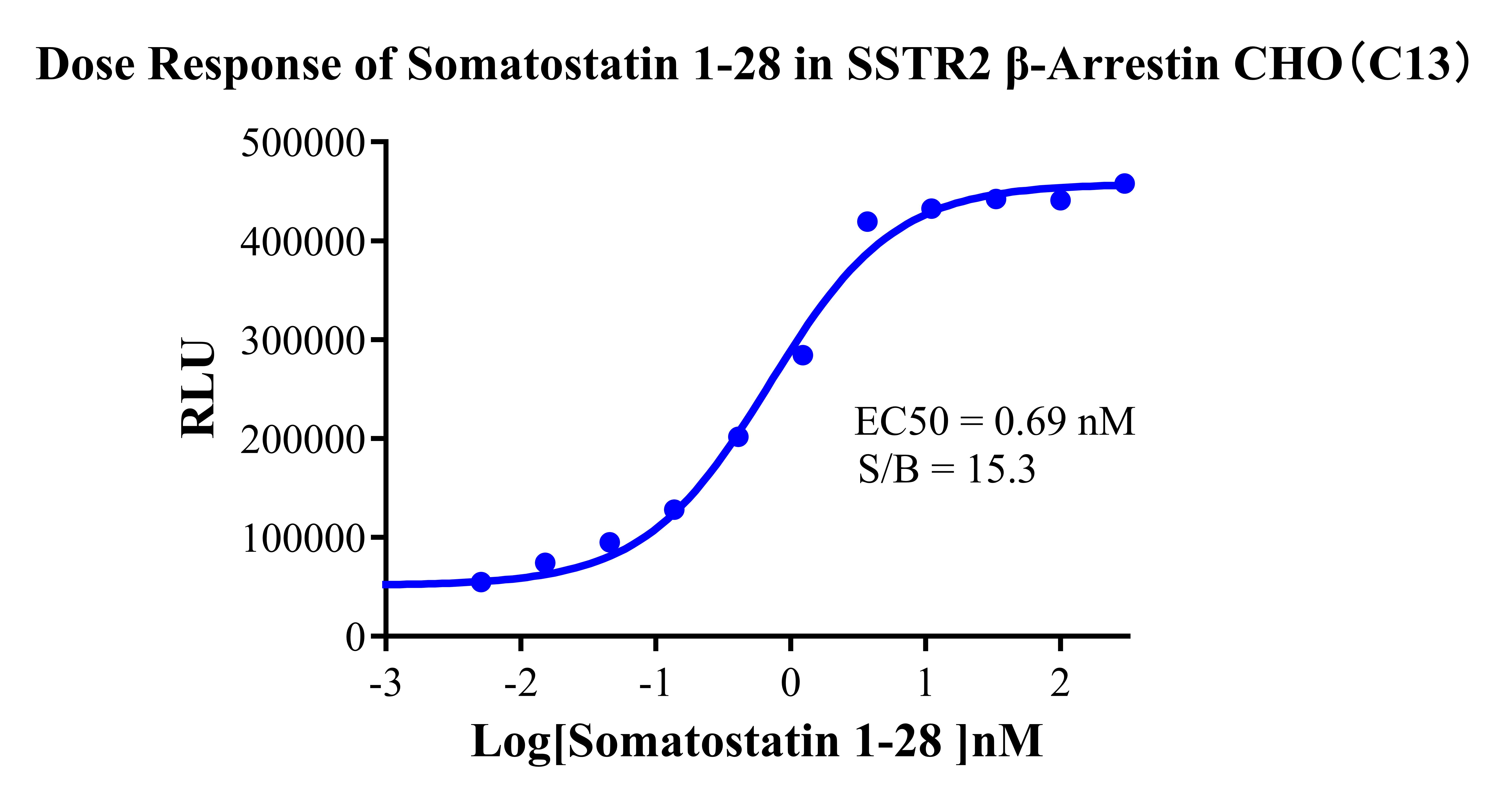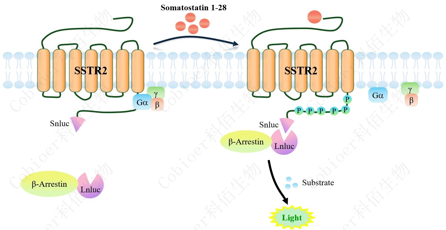 SSTR2 β-Arrestin CHO 報告基因藥靶模型很好的模擬了體內(nèi) SSTR2/β-Arrestin 的信號 轉(zhuǎn)導過程,原理見下圖所示。當缺乏配體刺激時,β-Arrestin 不與 SSTR2 結合,融合β- Arrestin 的熒光素酶處于失活構象,當 SSTR2 遭遇配體刺激時,融合熒光素酶報告基因的 β-Arrestin 被招募,使熒光素酶報告基因處于激活狀態(tài),加入其底物后發(fā)光信號增強。