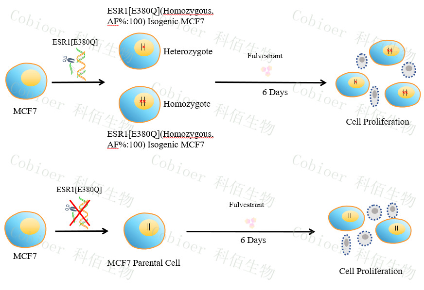 ESR1[E380Q](Homozygous,AF%:100) Isogenic MCF7 藥靶細(xì)胞,通過(guò)基因編輯的方式將 ESR1 的 380 位氨基酸谷氨酸(E)突變?yōu)楣劝滨0罚≦)。![]() 圖 1: ESR1[E380Q](Homozygous,AF%:100) Isogenic MCF7 細(xì)胞的構(gòu)建原理圖