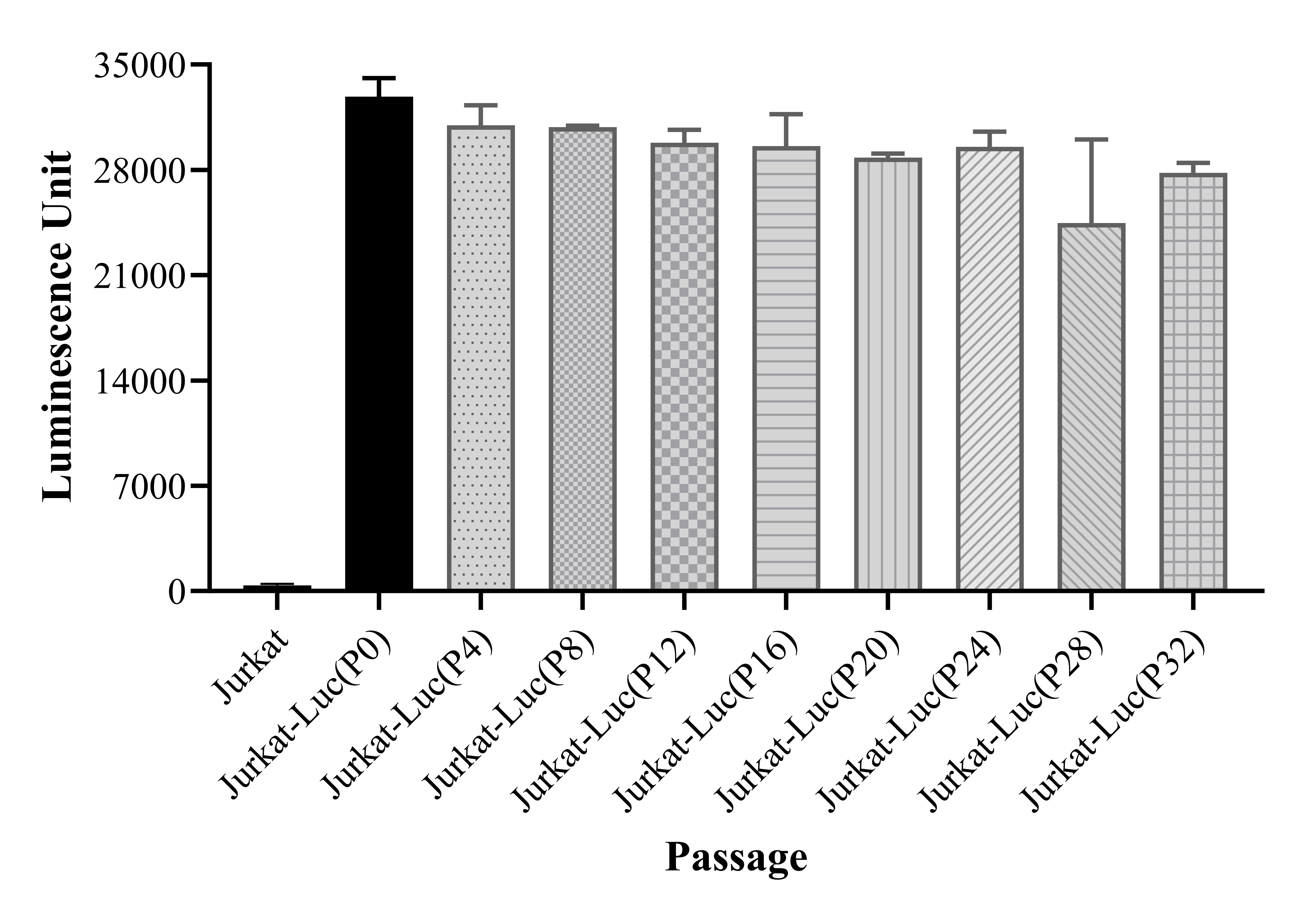 Figure 1. Stablity test results. Jurkat-Luc showed at least 32 passage stability with similar luminescence unit.  |