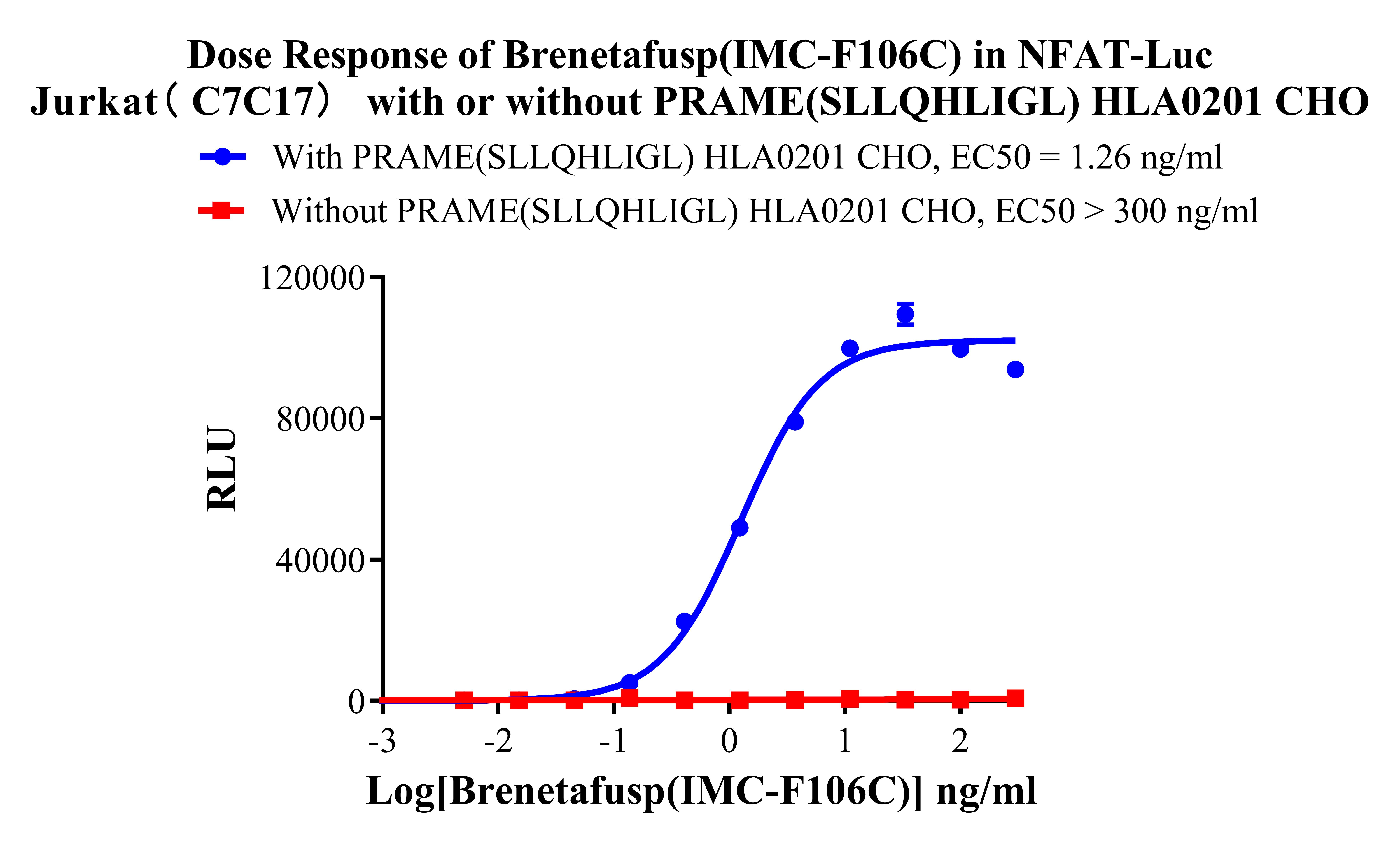 Figure 1.Dose Response of Brenetafusp (IMC-F106C)in NFAT-Luc Jurkat( C7C17) with or without PRAME(SLLQHLIGL) HLA0201 CHO.  |