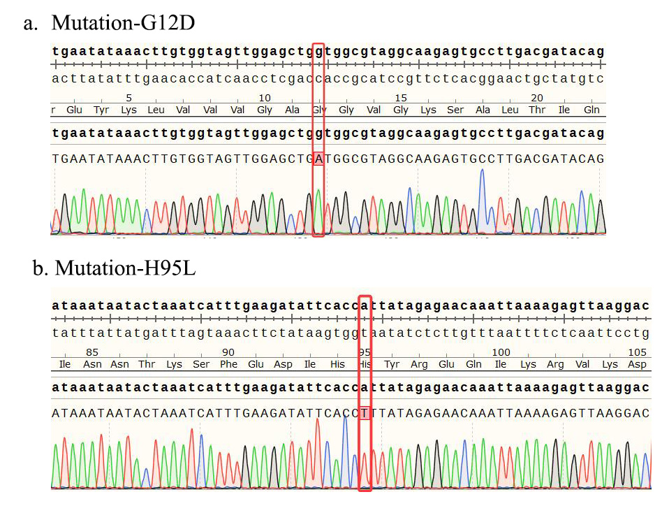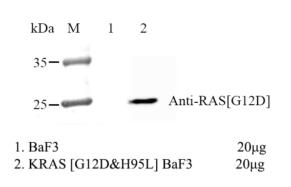 1.WB of KRAS [G12D&H95L] BaF3 Figure 2. WB of KRAS [G12D&H95L] BaF3 2.Sanger of KRAS [G12D&H95L] BaF3  |
