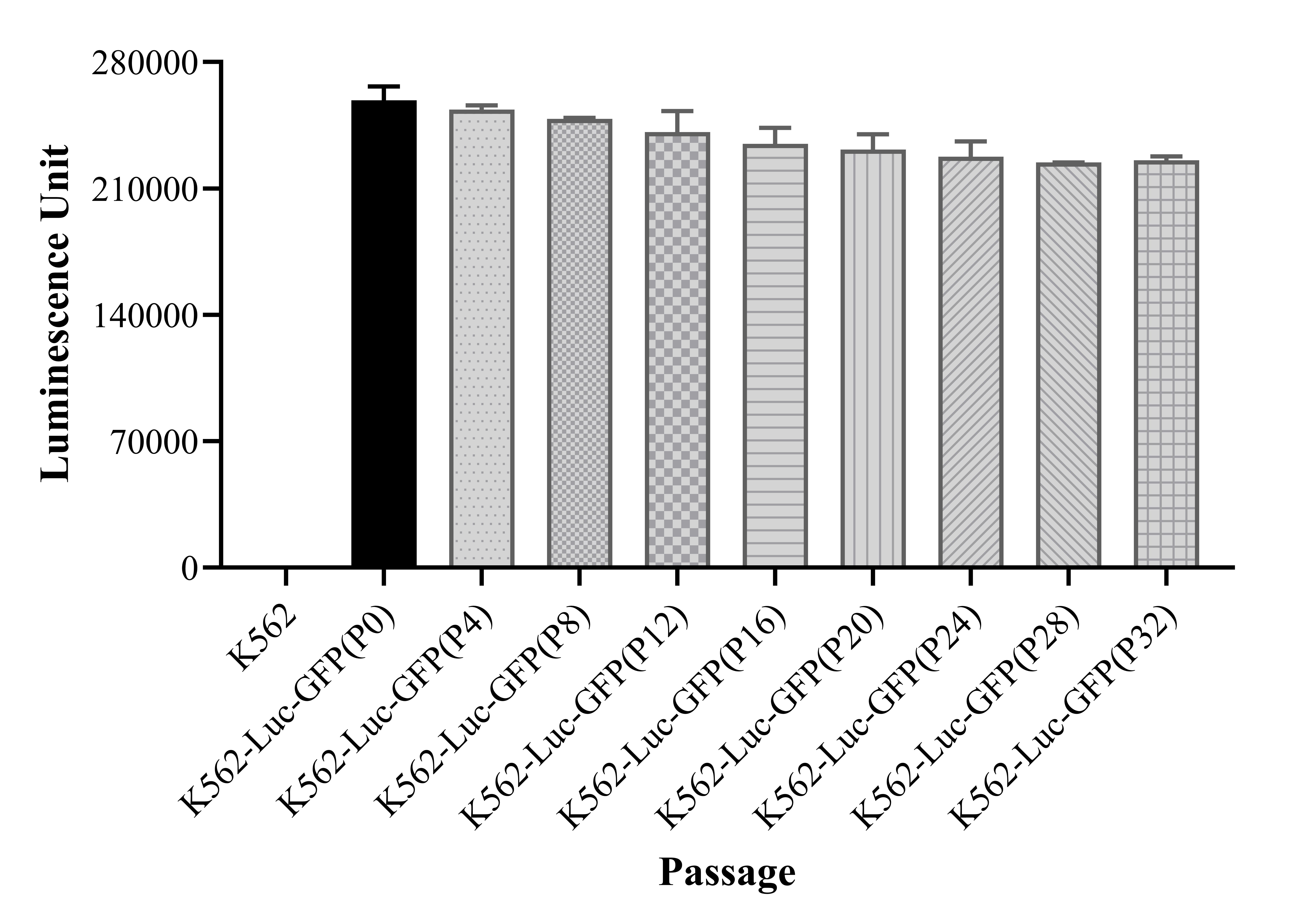 Figure 2. Stablity test results. K562-Luc-GFP showed at least 32 passage stability with similar luminescence unit.  |