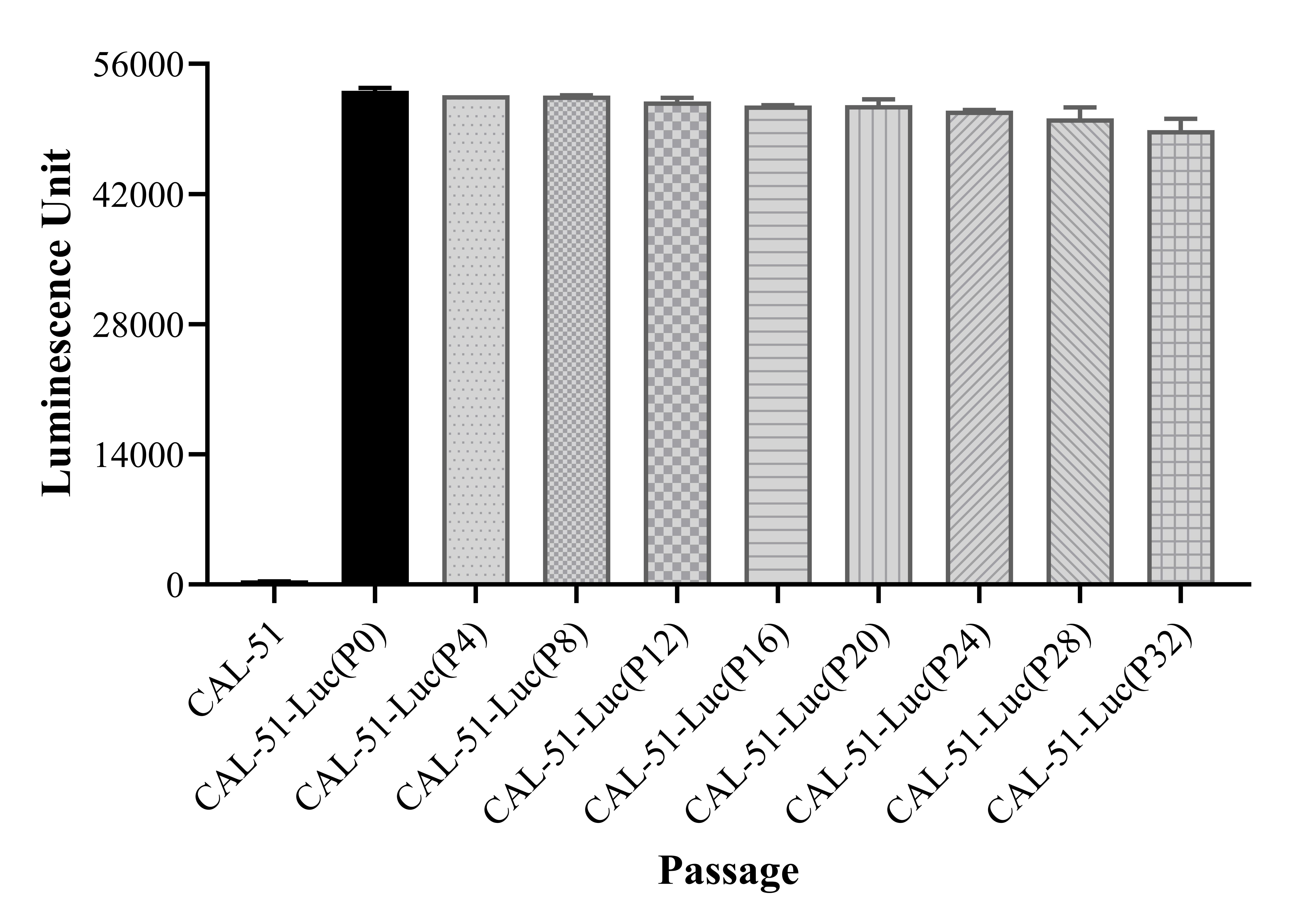 Figure 1. Stablity test results. CAL-51-Luc showed at least 32 passage stability with similar luminescence unit.  |