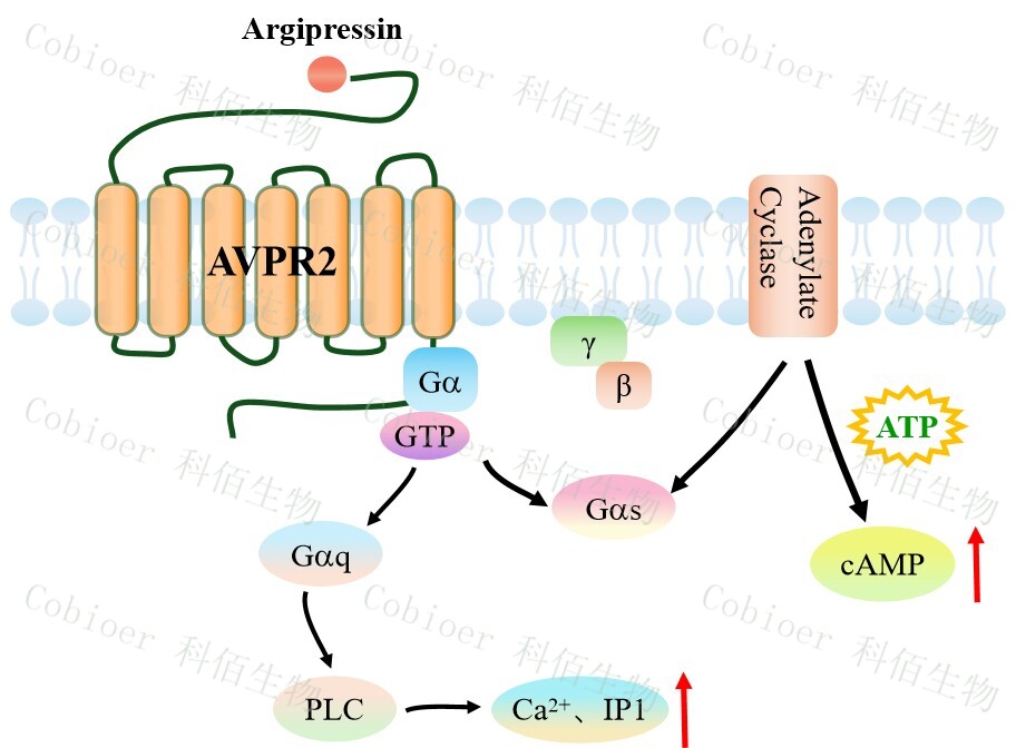 AVPR2(精氨酸加壓素受體 2 型)是一種主要分布于腎臟集合管上皮細胞基底側(cè)的 G 蛋白偶聯(lián)受體(GPCR),屬于加壓素/催產(chǎn)素受體家族,其特異性配體為垂體后葉分泌的 精氨酸加壓素(AVP,又稱抗利尿激素 ADH);該受體通過偶聯(lián) Gs 蛋白,激活腺苷酸環(huán) 化酶,升高 cAMP,激活蛋白激酶 A(PKA),最終磷酸化并促使水通道蛋白 AQP2 向細 胞膜轉(zhuǎn)位,從而增加水的重吸收、濃縮尿液并維持體液平衡;其功能缺陷是 X 連鎖隱性遺 傳性腎性尿崩癥(NDI) 的主要病因(占 90%),患者因基因突變導致受體失活,表現(xiàn)為 多尿、煩渴及低滲尿,而獲得性異常則與鋰中毒或梗阻性腎病相關(guān);此外,AVPR2 作為藥 物靶點,其拮抗劑(如托伐普坦)已用于治療低鈉血癥和心力衰竭的體液潴留。  |