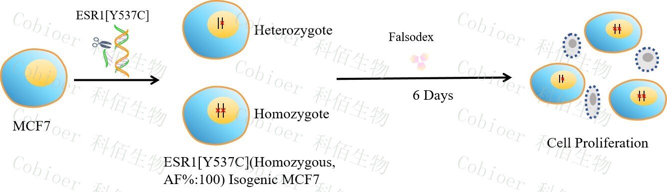 ESR1[Y537C](Homozygous,AF%:100) Isogenic MCF7 藥靶細(xì)胞,通過基因編輯的方式將 ESR1 的 537 位氨基酸酪氨酸(Y)突變?yōu)榘腚装彼幔–)。![]() Figure 1. ESR1[Y537C](Homozygous,AF%:100) Isogenic MCF7 原理示意圖  |