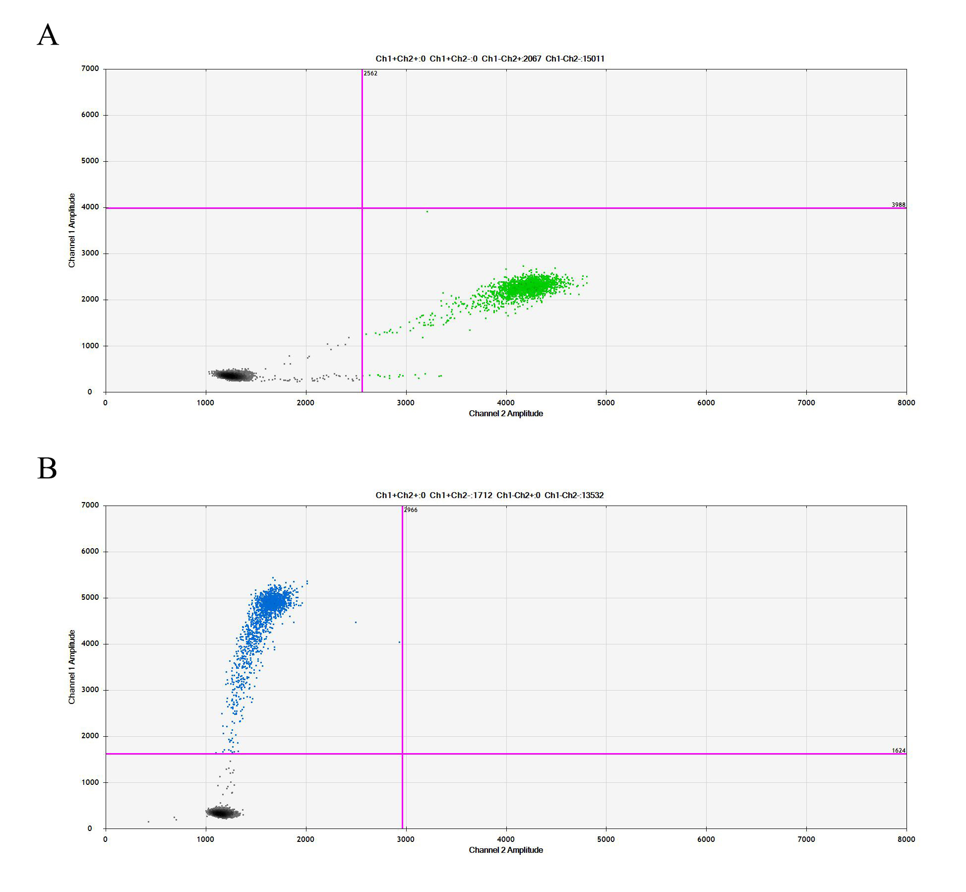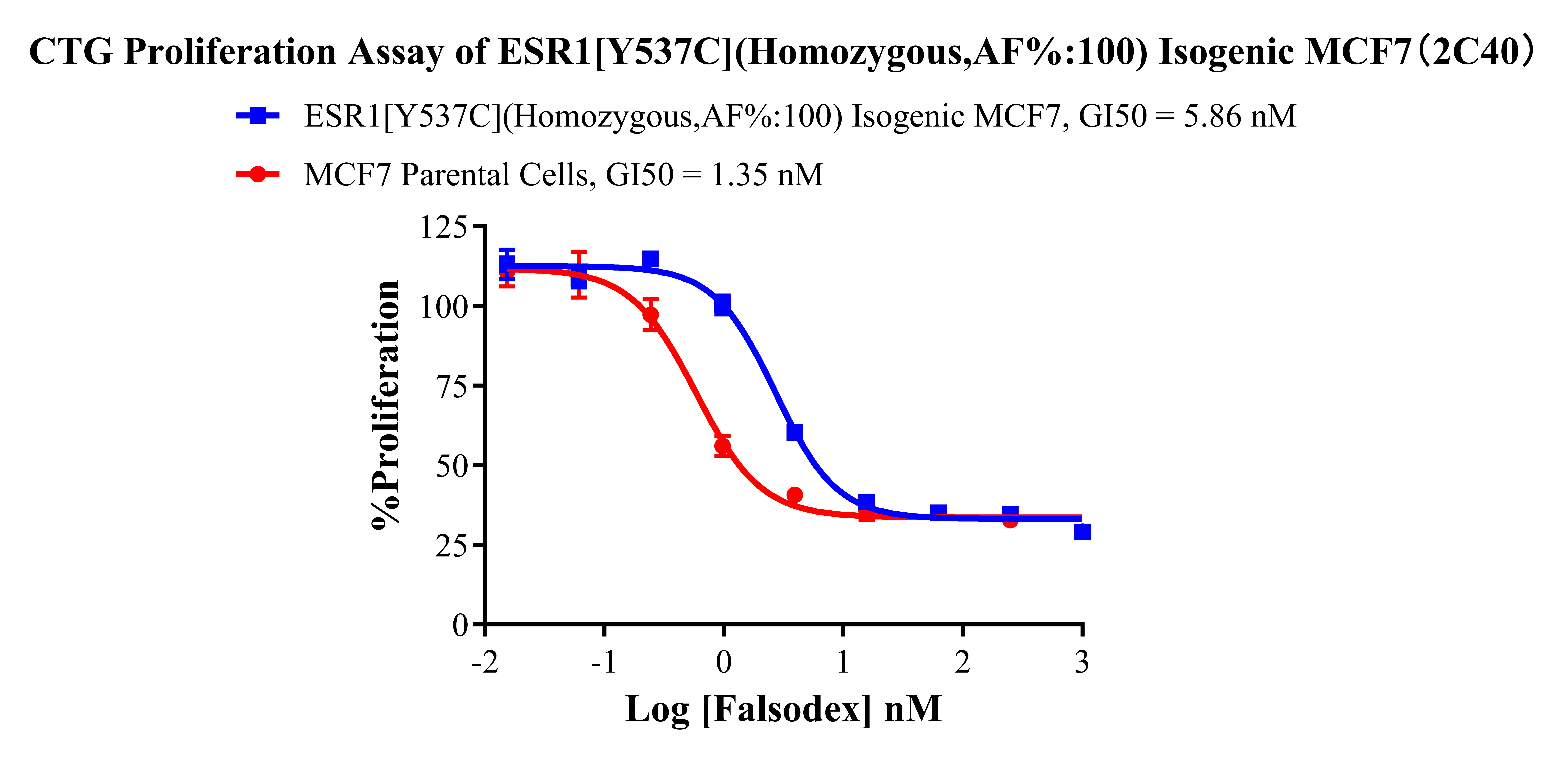 ![]() Figure 2. Sanger of ESR1[Y537C](Homozygous,AF%:100) Isogenic MCF7. ![]() Figure 3. A: MCF7 Parental Cell;B:ESR1[Y537C](Homozygous,AF%:100) Isogenic MCF7 通道2 藍(lán)色微滴代表ESR1[Y537C]突變陽(yáng)性,通道2 綠色微滴代表該位點(diǎn)為陰性野生型 ![]() Figure 4. CTG Proliferation Assay of ESR1[Y537C](Homozygous,AF%:100) lsogenic MCF7(2C40).  |
