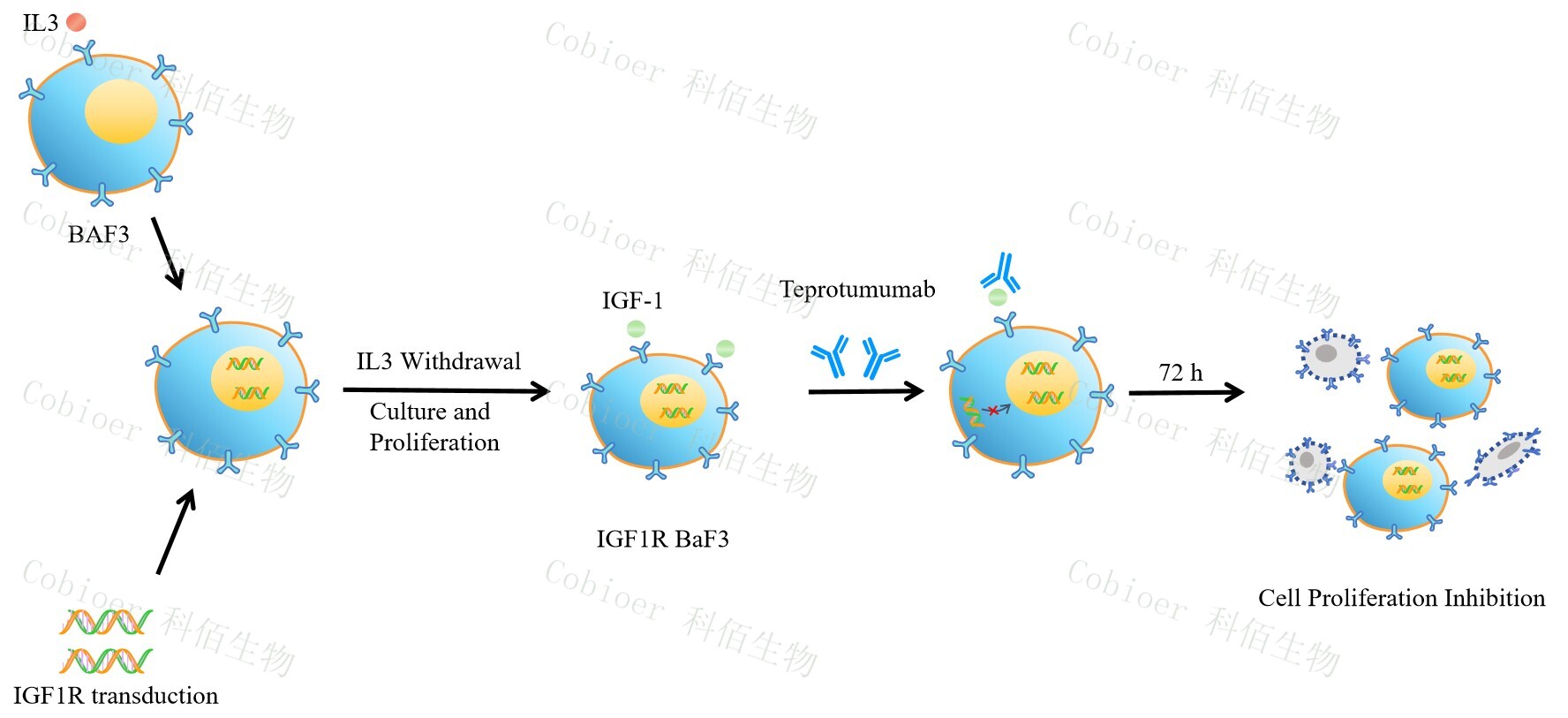 BaF3(小鼠原 B 細胞)的生長和增殖需要 IL-3 的維持。通過引入各種表達激酶的基因, 能作為 BaF3 的驅動基因,讓 BaF3 不再依賴 IL-3 而增殖,進而激酶基因成為 BaF3 增殖依 賴的驅動基因,用于評估小分子藥物對激酶的靶向抑制作用,原理及流程見下圖所示。![]() Figure 1. IGF1R BaF3 細胞模型原理圖  |