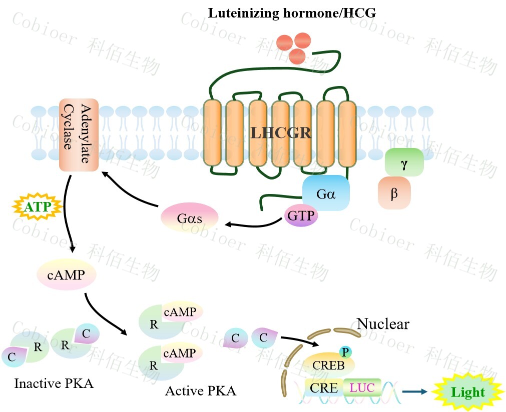 LHCGR CRE-Luc HEK293 報(bào)告基因藥靶模型很好的模擬了體內(nèi) LHCGR 的信號(hào)轉(zhuǎn)導(dǎo)過(guò)程,原理見(jiàn)下圖所示。![]() Figure 1. LHCGR CRE-Luc HEK293 細(xì)胞模型原理圖  |