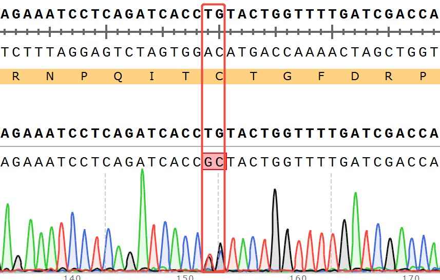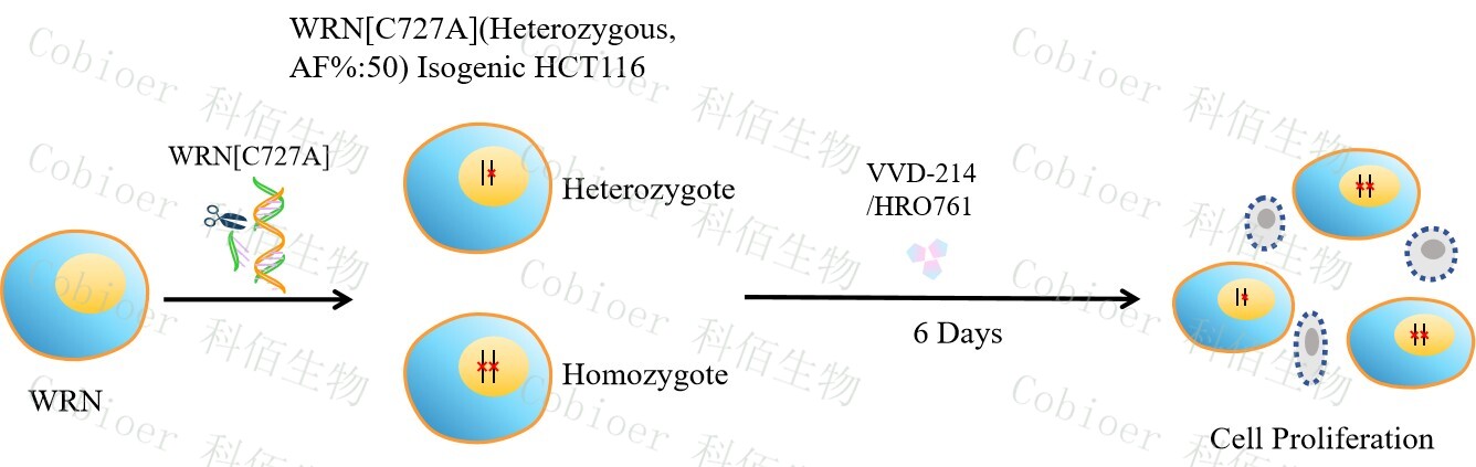 WRN[C727A](Heterozygous,AF%:50) Isogenic HCT116 藥靶細(xì)胞,通過(guò)基 因編輯的方式將 WRN 的 727 位氨基酸胱氨酸(C)突變?yōu)楸彼幔ˋ)。![]() Figure 1. WRN[C727A](Heterozygous,AF%:50) Isogenic HCT116 原理示意圖  |