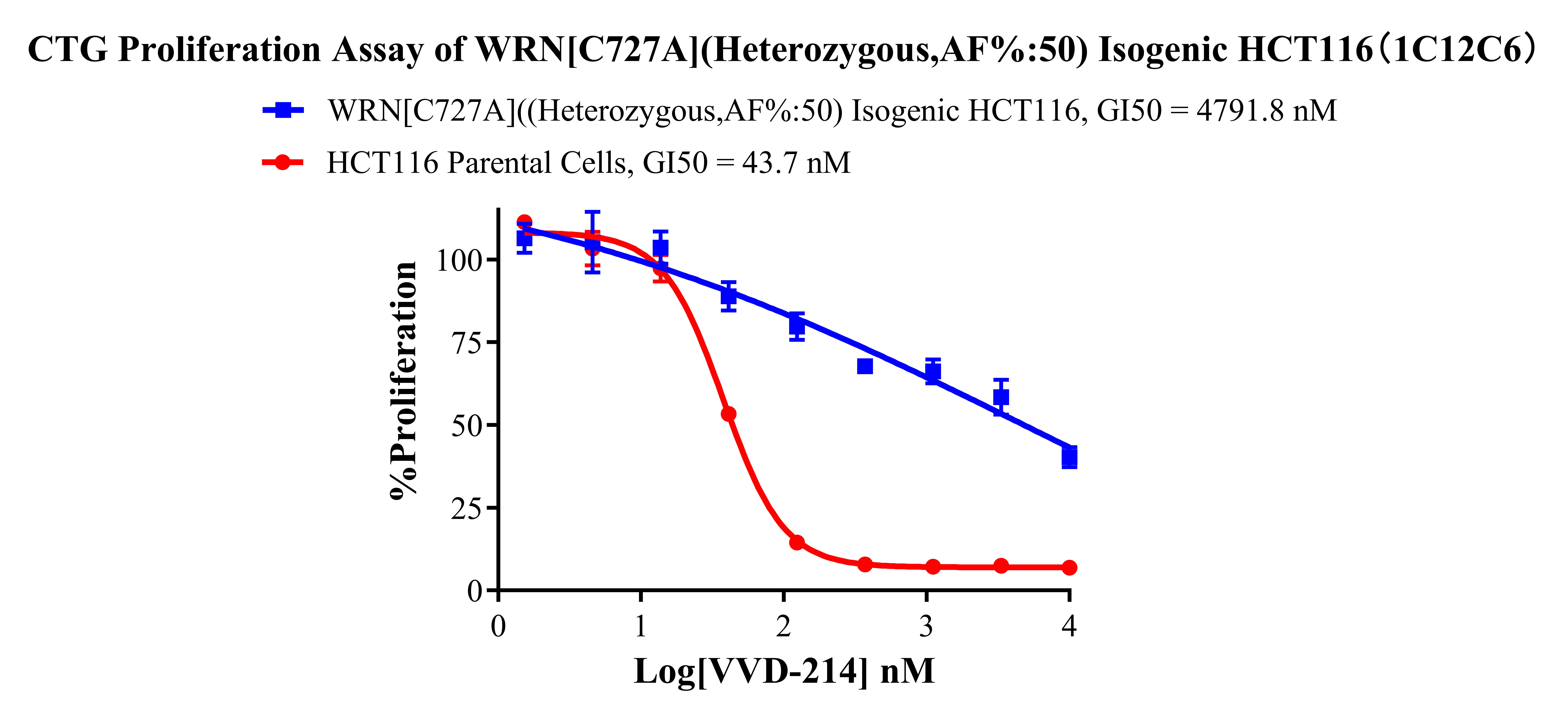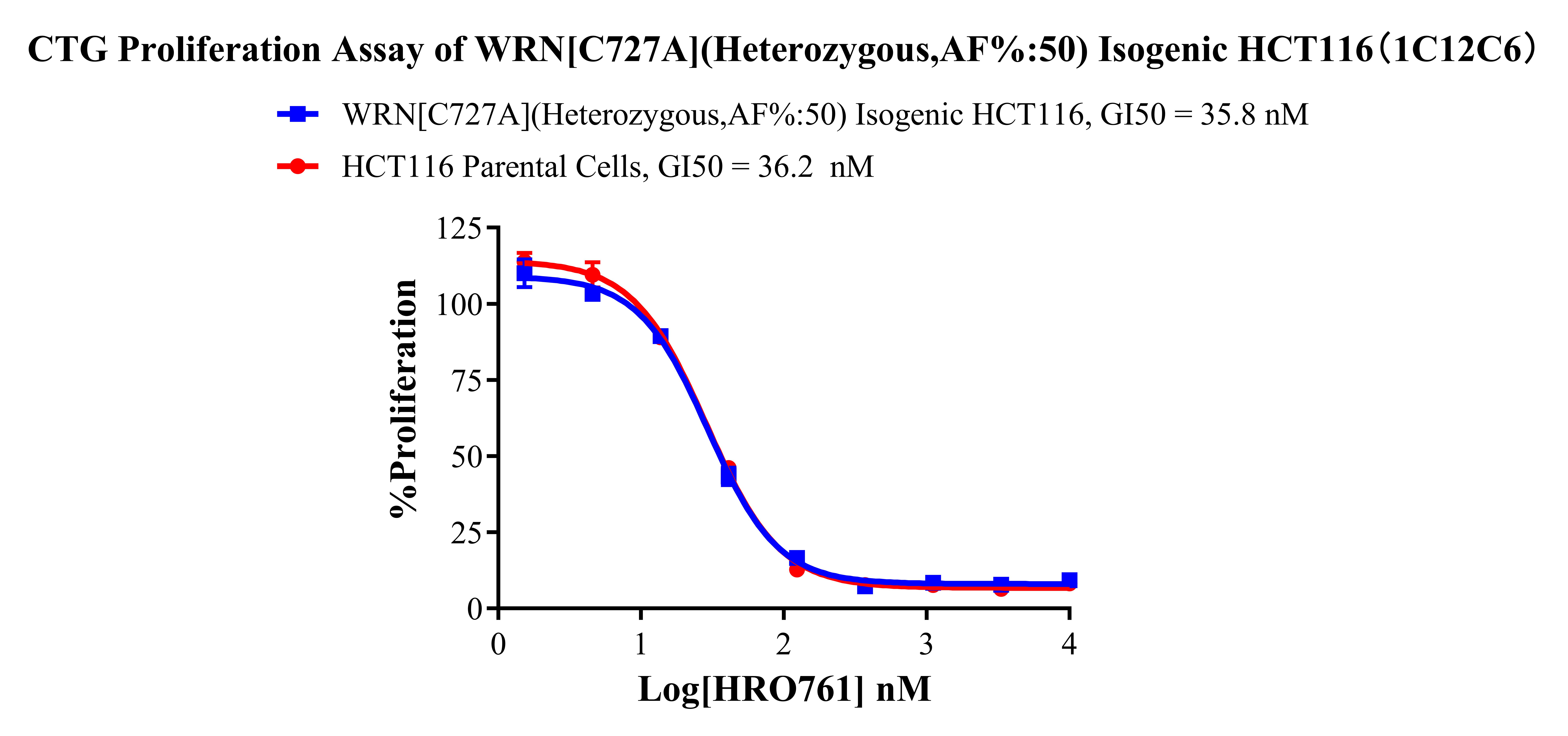 Figure 2. Sanger of WRN[C727A](Heterozygous,AF%:50) Isogenic HCT116![]() Figure 3. A:HCT116 Parental Cell;B:WRN[C727A](Heterozygous,AF%:50) Isogenic HCT116 通道2 藍(lán)色微滴代表WRN[C727A]突變陽(yáng)性,通道2 綠色微滴代表該位點(diǎn)為陰性野生型 ![]() Figure 4. CTG Proliferation Assay of WRN[C727A](Heterozygous,AF%:50) Isogenic HCT116(1C12C6). ![]() Figure 5. CTC Proliferation Assay of WRN[C727A](Heterozygous,AF%:50) lsogenic HCT116(1C12C6).  |