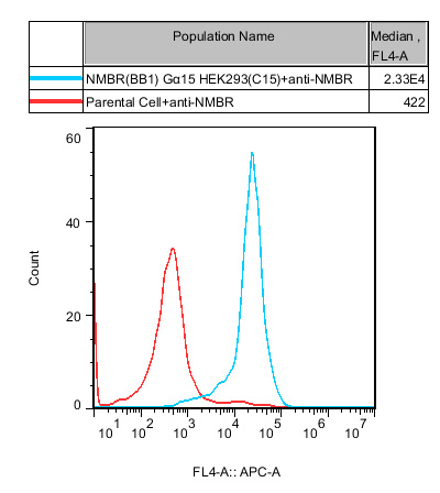 NMBR(BB1) Gα15 HEK293 細胞藥靶模型很好的模擬了體內(nèi) NMBR(BB1)&Gα15 的信號轉(zhuǎn)導過程,原理見下圖所示。![]() Figure 1. NMBR(BB1) Gα15 HEK293 細胞模型原理圖  |