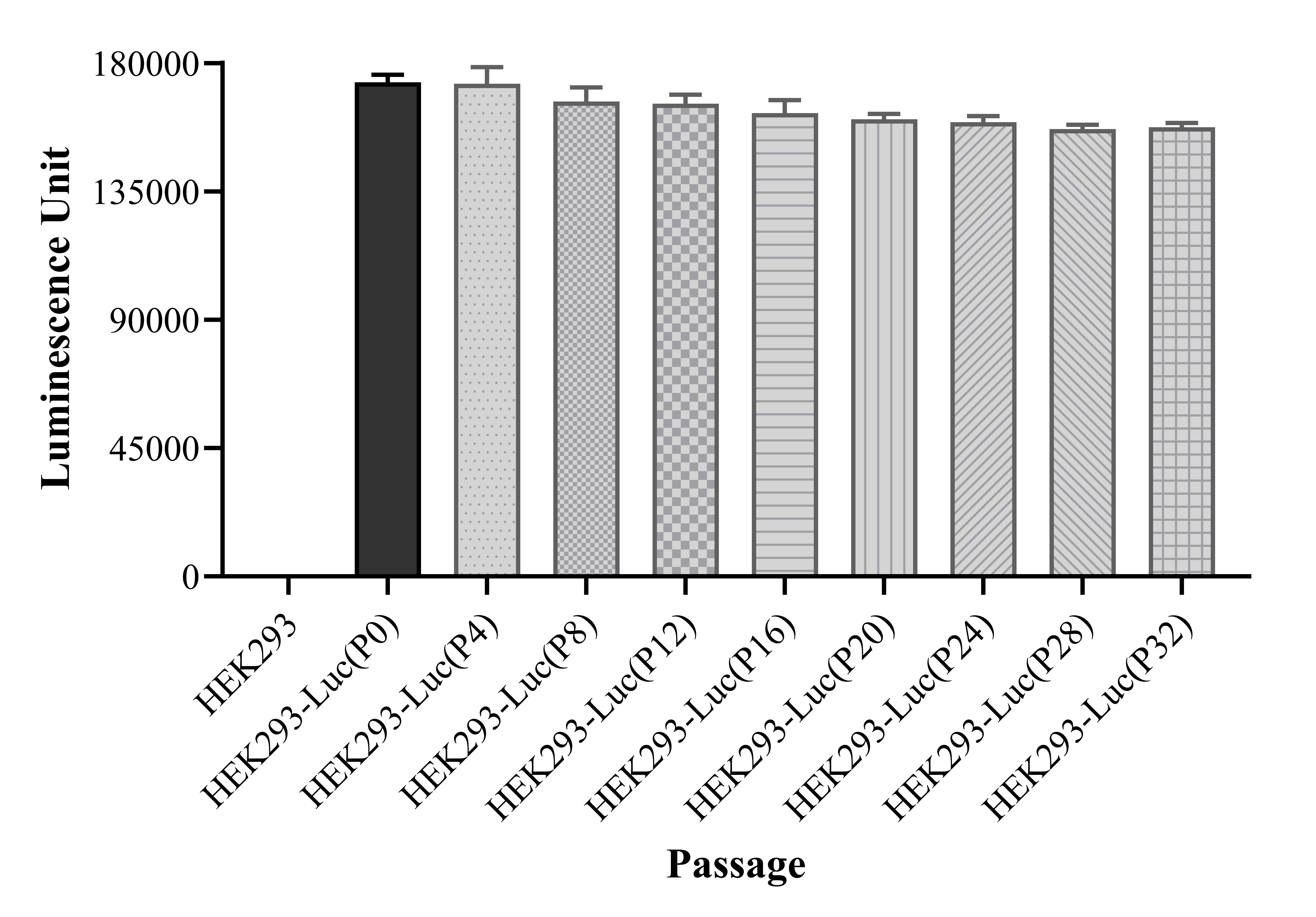 Figure 1. Stablity test results. HEK293-Luc showed at least 32 passage stability with similar luminescence unit.