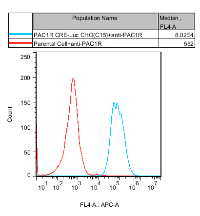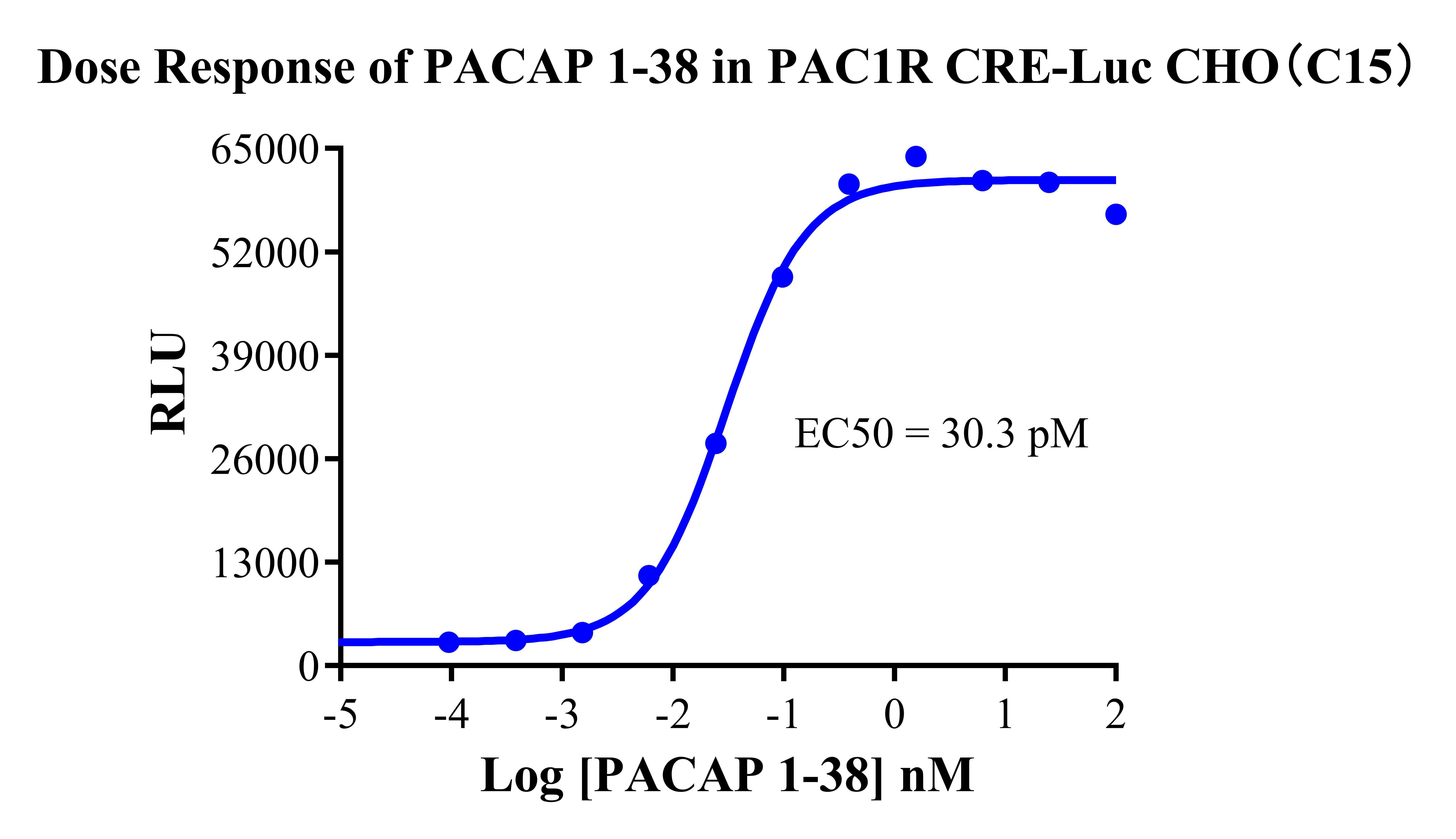 V. Representative Data![]() Figure 1. Recombinant PAC1R CRE-Luc CHO stably expressing PAC1R. ![]() Figure 2. Dose Response of PACAP 1-38 in PAC1R CRE-Luc CHO(C15). ![]() Figure 3. Inhibition of PACAP 1-38 induced Reporter Activity by PACAP38 Neutralization Ab in PAC1R CRE-Luc CHO(C15).  |