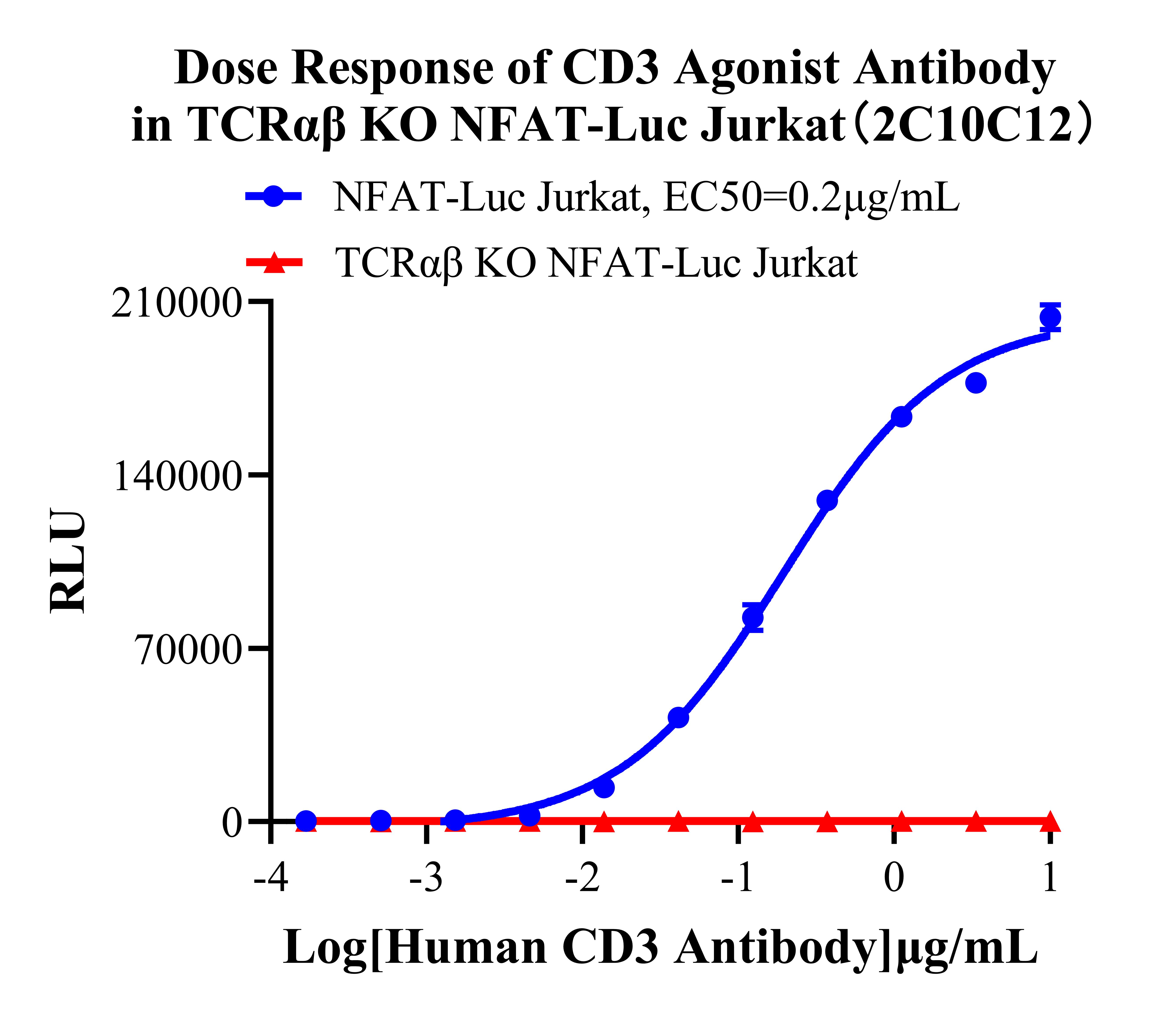 ![]() Figure 2. WB of TCRαβ KO NFAT-Luc Jurkat. ![]() Figure 3. Dose Response of CD3 Agonist Antibody in TCRαβ KO NFAT-Luc Jurkat(2C10C12).  |