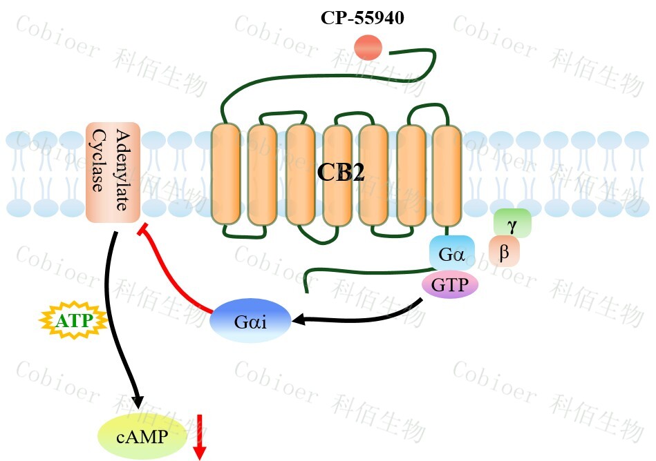 cAMP 在 G 蛋白偶聯(lián)受體(GPCR)信號轉(zhuǎn)導(dǎo)中是一種關(guān)鍵的第二信使。當(dāng)配體結(jié)合到 GPCR,構(gòu)象發(fā)生變化,激活受體接著激活 G 蛋白,Gi 的激活導(dǎo)致腺苷酸環(huán)化酶調(diào)控 cAMP 的下調(diào)。CB2 CHO 藥靶模型很好的模擬了體內(nèi) CB2 的信號轉(zhuǎn)導(dǎo)過程,原理見下圖所示。![]() Figure 1. CB2 CHO 細(xì)胞模型原理圖  |