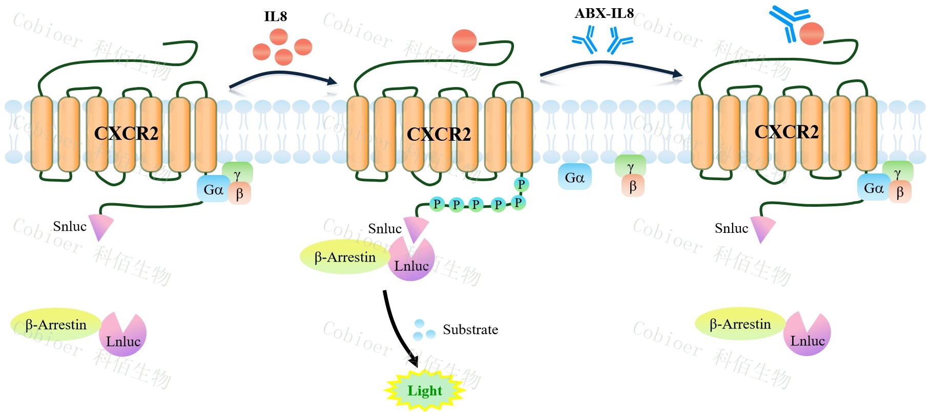 CXCR2 β-Arrestin CHO 報告基因藥靶模型很好的模擬了體內(nèi) CXCR2/β-Arrestin 的信號轉(zhuǎn)導(dǎo)過程,原理見下圖當(dāng)缺乏配體刺激時,β-Arrestin 不與 CXCR2 結(jié)合,融合β- Arrestin 的熒光素酶處于失活構(gòu)象,當(dāng) CXCR2 遭遇配體刺激時,融合熒光素酶報告基因的 β-Arrestin 被招募,使熒光素酶報告基因處于激活狀態(tài),加入其底物后發(fā)光信號增強。![]() Figure 1. CXCR2 β-Arrestin CHO 細(xì)胞模型原理圖  |