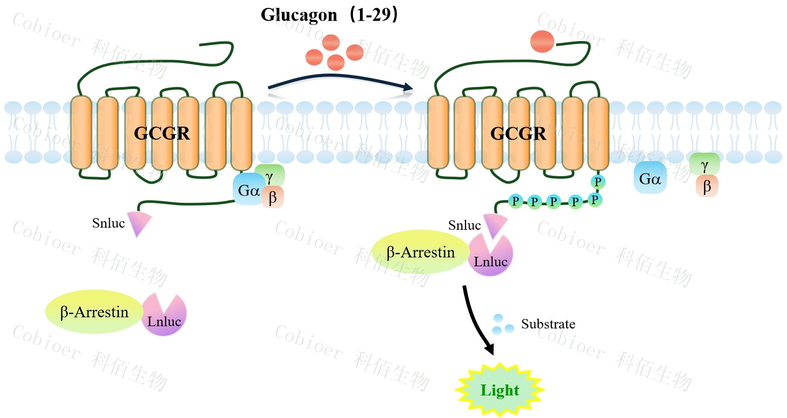 GCGR β-Arrestin CHO 報告基因藥靶模型很好的模擬了體內(nèi) GCGR/β-Arrestin 的信號轉(zhuǎn) 導(dǎo)過程,原理見下圖所示。當(dāng)缺乏配體刺激時,β-Arrestin 不與 GCGR 結(jié)合,融合β- Arrestin 的熒光素酶處于失活構(gòu)象;當(dāng) GCGR 遭遇配體刺激時,融合熒光素酶報告基因的β- Arrestin 被招募,使熒光素酶報告基因處于激活狀態(tài),加入其底物后發(fā)光信號增強。![]() Figure 1. GCGR β-Arrestin CHO 細胞模型原理圖  |