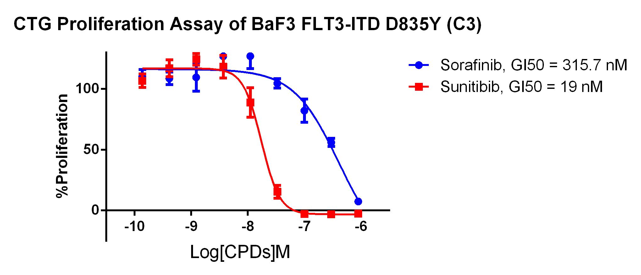 Figure . Anti-proliferation assay of two reference compounds on the FLT3-ITD [D835Y]/BaF3 Stable Cell Line.  |