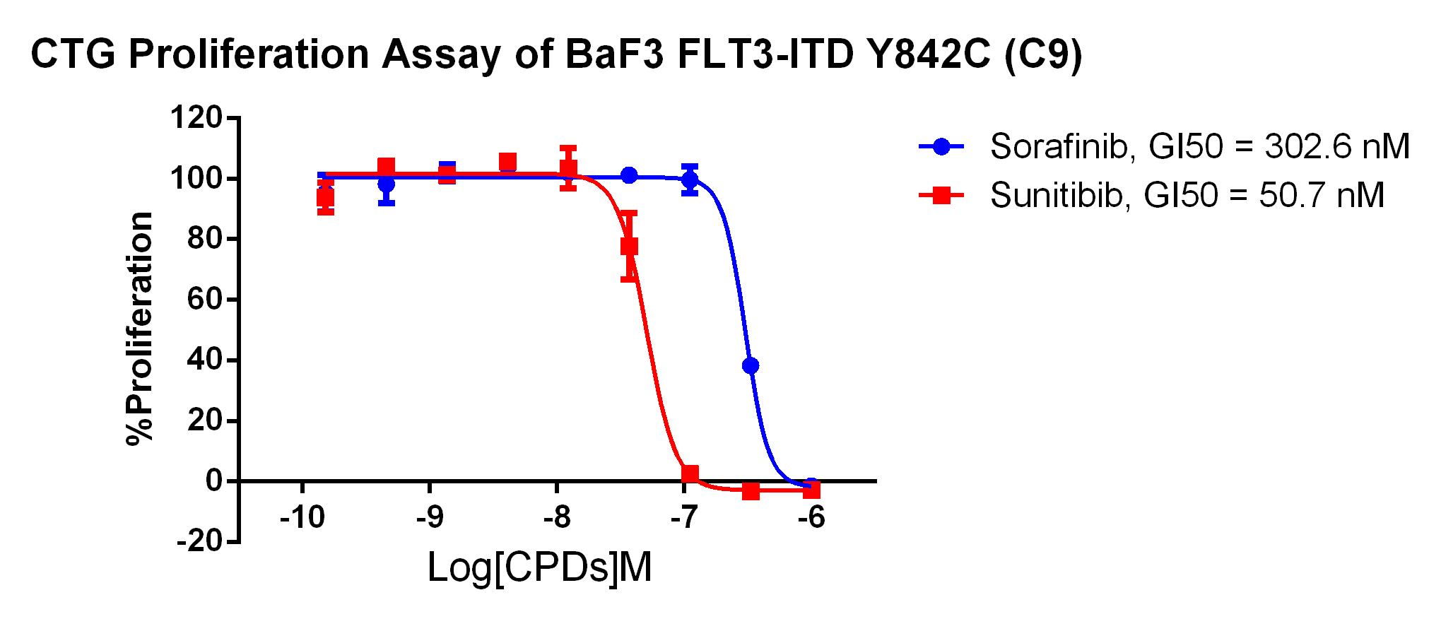 Figure 2. Anti-proliferation assay of two reference compounds on the FLT3-ITD [Y842C]/BaF3 Stable Cell Line.  |