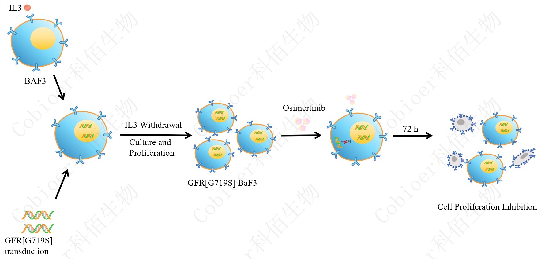 BaF3(小鼠原 B 細胞)的生長和增殖需要 IL-3 的維持。通過引入各種表達激酶的基因, 能作為 BaF3 的驅(qū)動基因,讓 BaF3 不再依賴 IL-3 而增殖,進而激酶基因成為 BaF3 增殖依 賴的驅(qū)動基因,用于評估小分子藥物對激酶的靶向抑制作用,原理及流程見下圖所示。