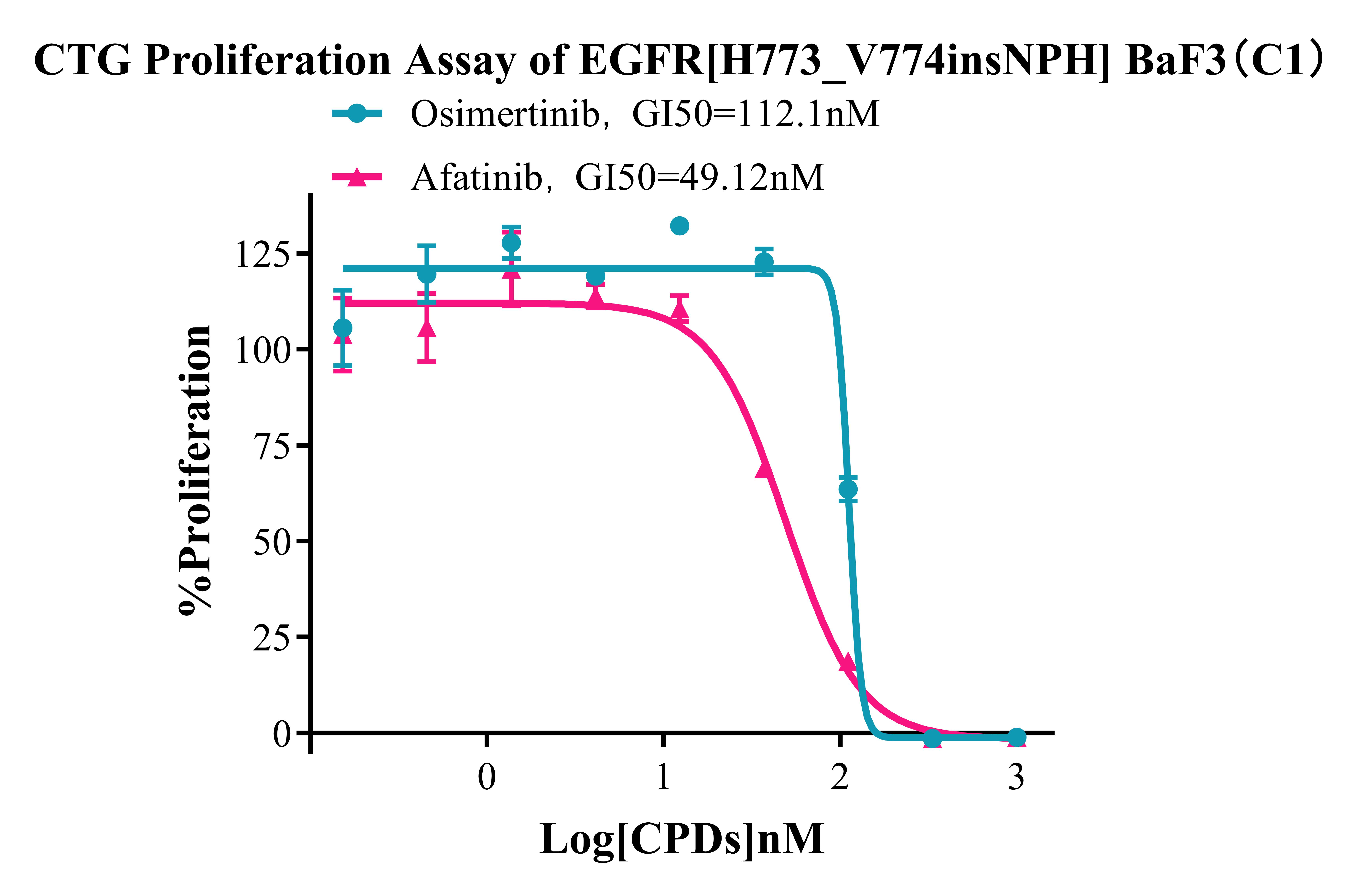 BaF3(小鼠原 B 細胞)的生長和增殖需要 IL-3 的維持。通過引入各種表達激酶的基因, 能作為 BaF3 的驅(qū)動基因,讓 BaF3 不再依賴 IL-3 而增殖,進而激酶基因成為 BaF3 增殖依 賴的驅(qū)動基因,用于評估小分子藥物對激酶的靶向抑制作用,原理及流程見下圖所示。![]() Figure 1. EGFR[H773_V774insNPH] BaF3 細胞的構(gòu)建原理圖  |