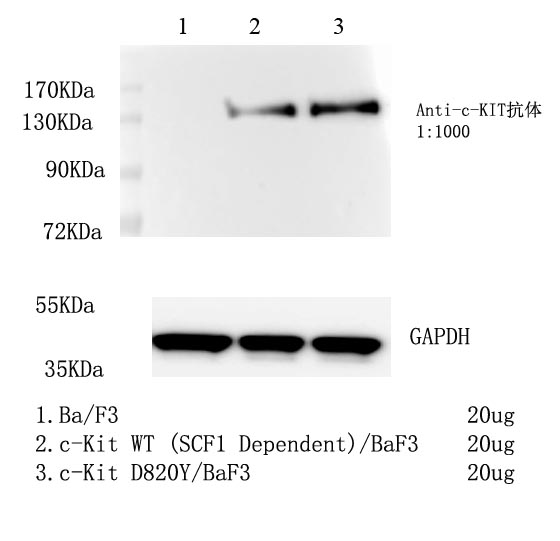 | KIT D820Y lies within the protein kinase domain of the Kit protein (UniProt.org). D820Yresuts in constitutive phosphorylation of Kit and is transforming in cell culture, and has also been identified as a secondary mutation associated with imatinib-resistance. | |