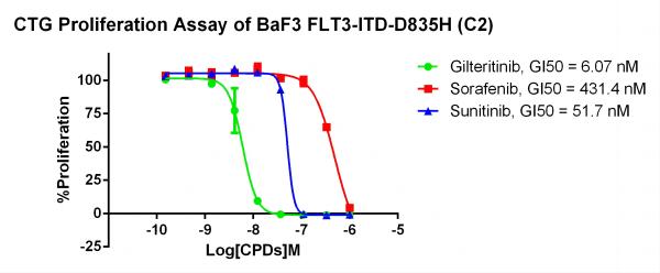 Figure . Anti-proliferation assay of three reference compounds on the FLT3-ITD [D835H]/BaF3 Stable Cell Line.