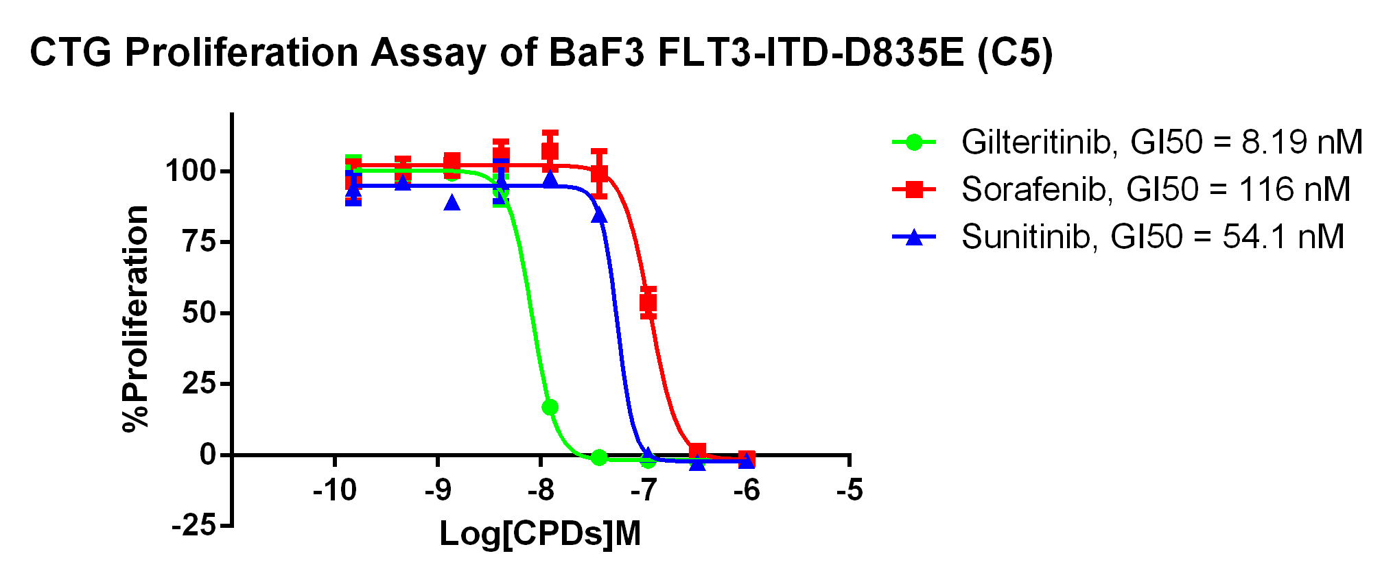 Figure . Anti-proliferation assay of three reference compounds on the FLT3-ITD [D835E]/BaF3 Stable Cell Line.