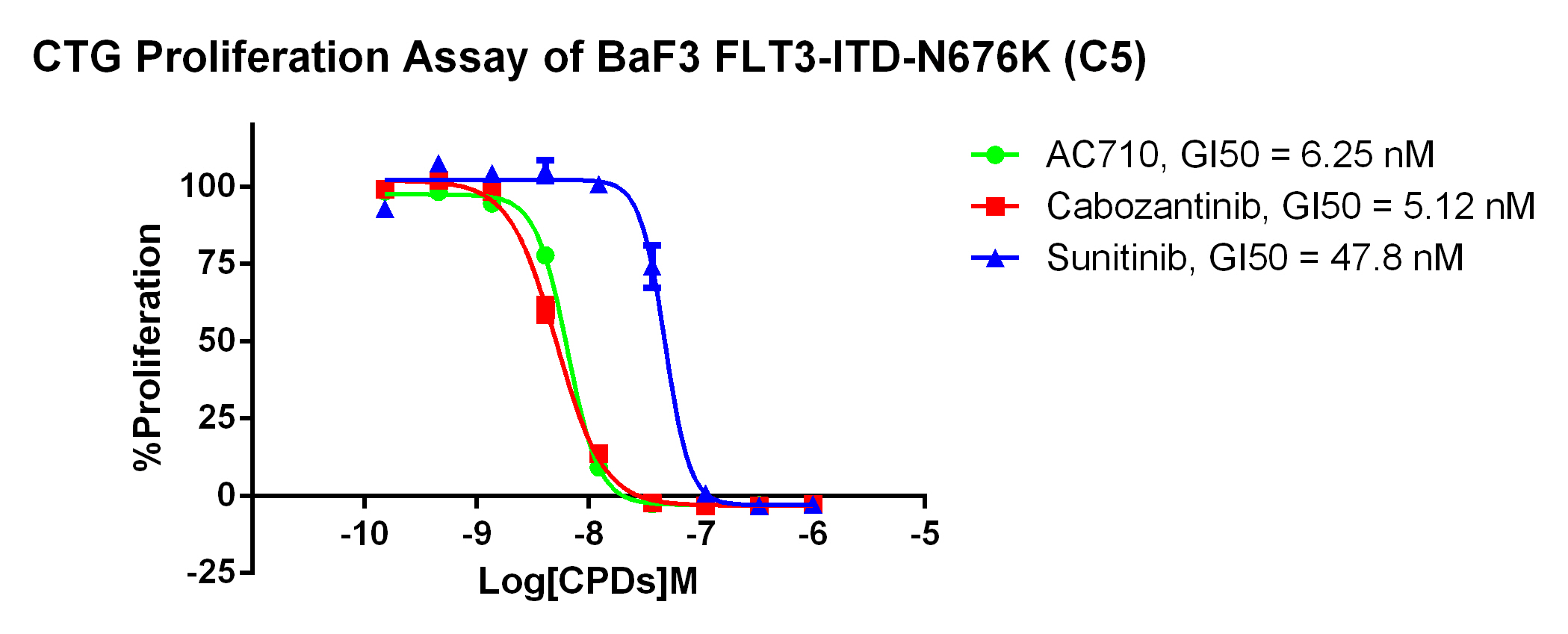 Figure 2. Anti-proliferation assay of two reference compounds on the FLT3-ITD [N676K]/BaF3 Stable Cell Line.  |