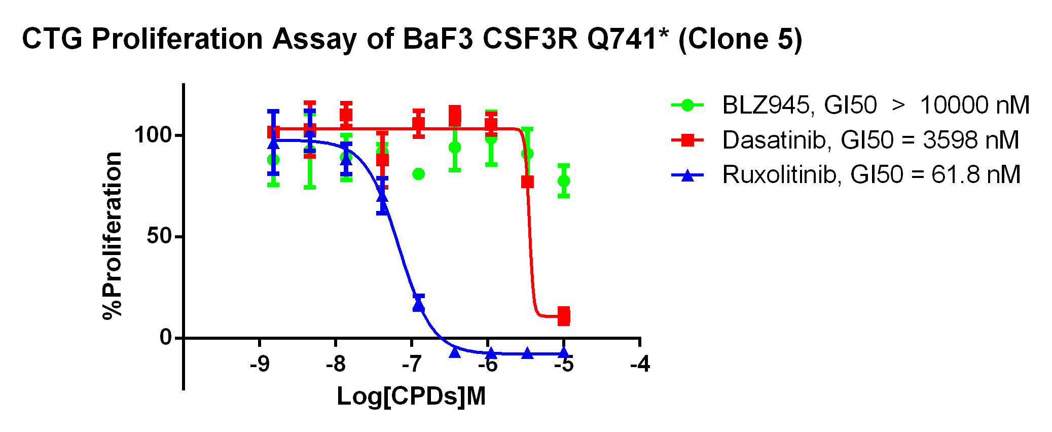 Figure 2. Anti-proliferation assay of three reference compounds on the CSF3R Q741/BaF3.  |