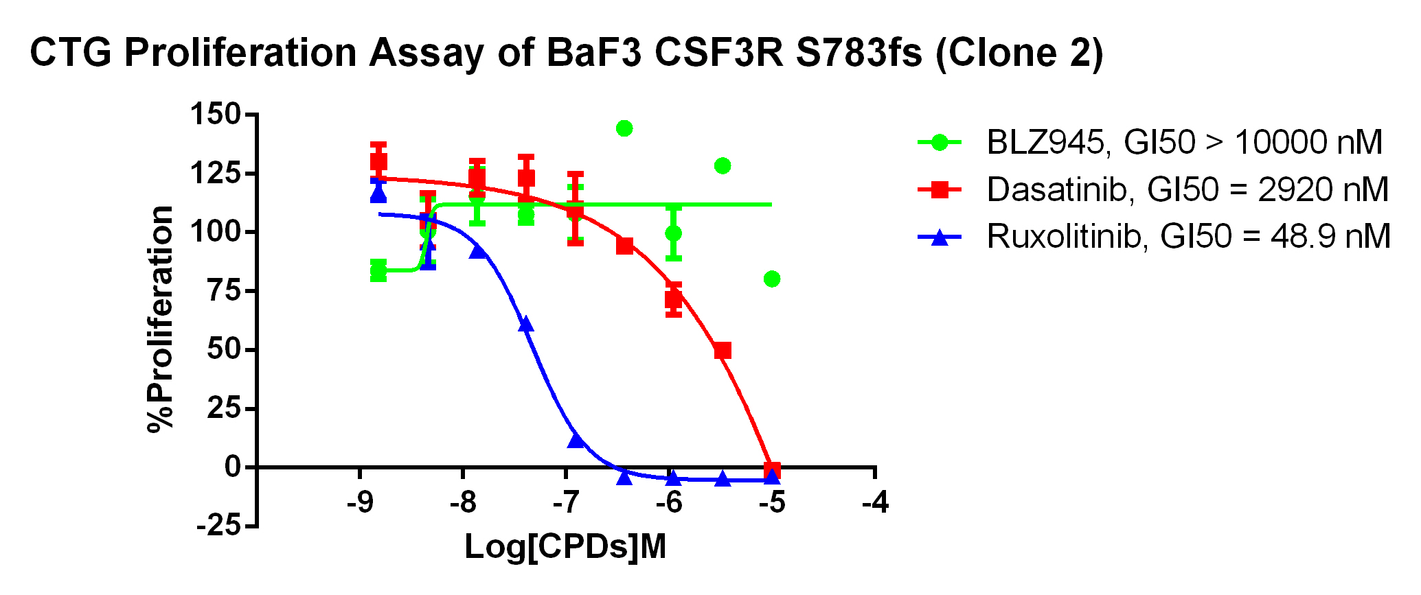 Figure 2. Anti-proliferation assay of three reference compounds on the CSF3R S783fs/BaF3.  |