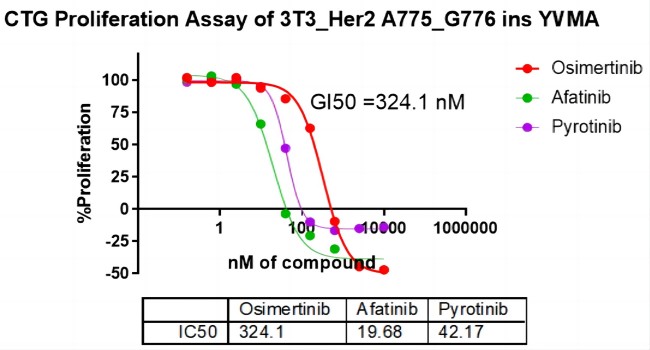 Figure 3. CTG Proliferation Assay of 3T3_Her2 A775_G776 ins YVMA.  |
