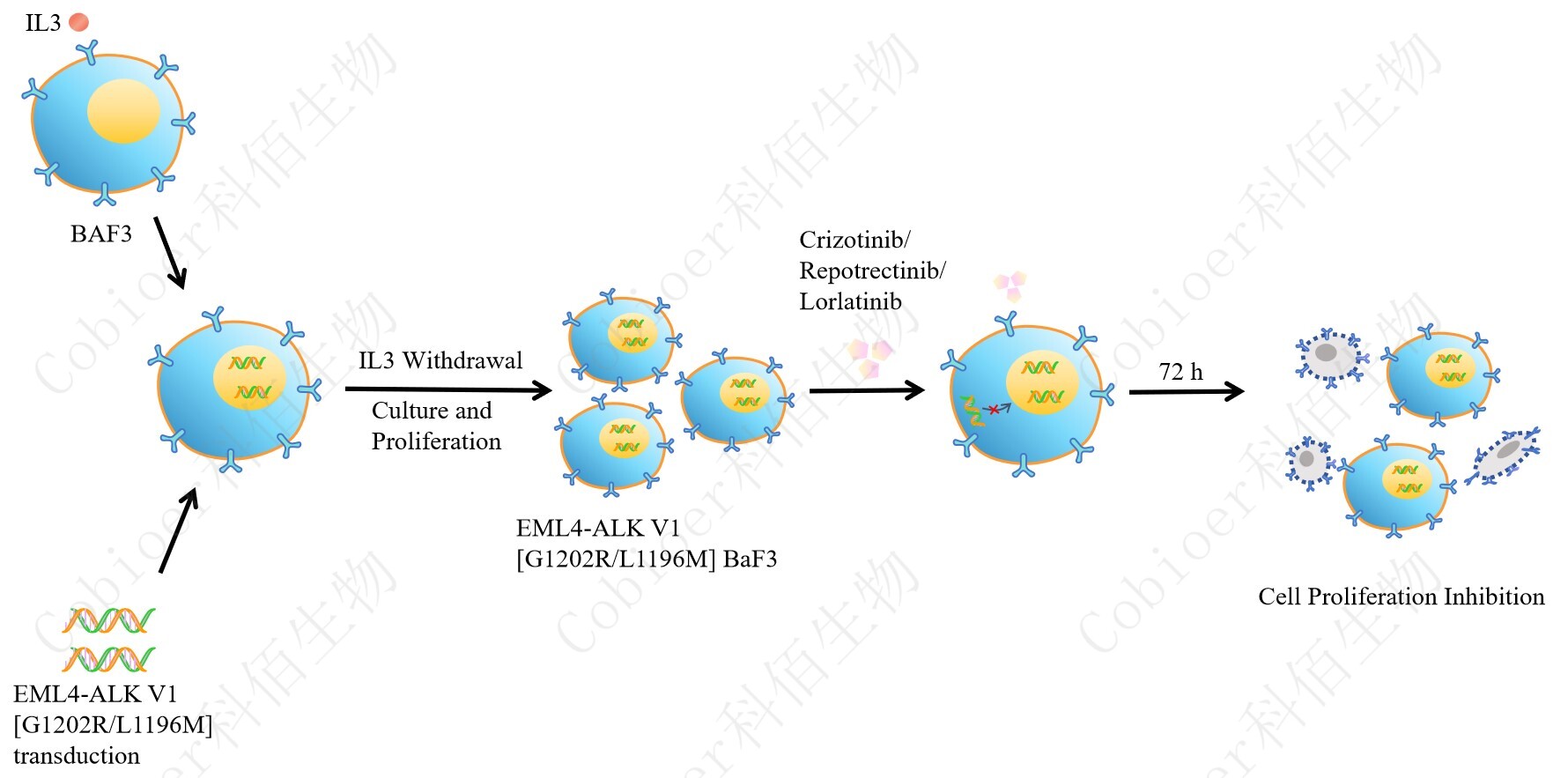 BaF3(小鼠原 B 細胞)的生長和增殖需要 IL-3 的維持。通過引入各種表達激酶的基因, 能作為 BaF3 的驅動基因,讓 BaF3 不再依賴 IL-3 而增殖,進而激酶基因成為 BaF3 增殖依 賴的驅動基因,用于評估小分子藥物對激酶的靶向抑制作用,原理及流程見下圖所示。