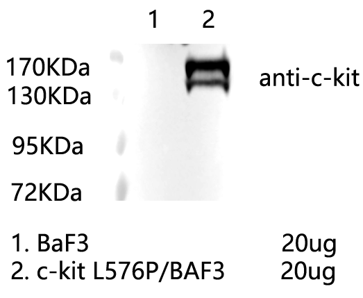 KIT L576P lies within the juxtamembrane domain (exon 11) of the Kit protein (PMID: 17372901). L576P confers a gain of function to Kit, as indicated by constitutive phosphorylation of Kit, and is transforming in cell culture (PMID: 17372901).  |