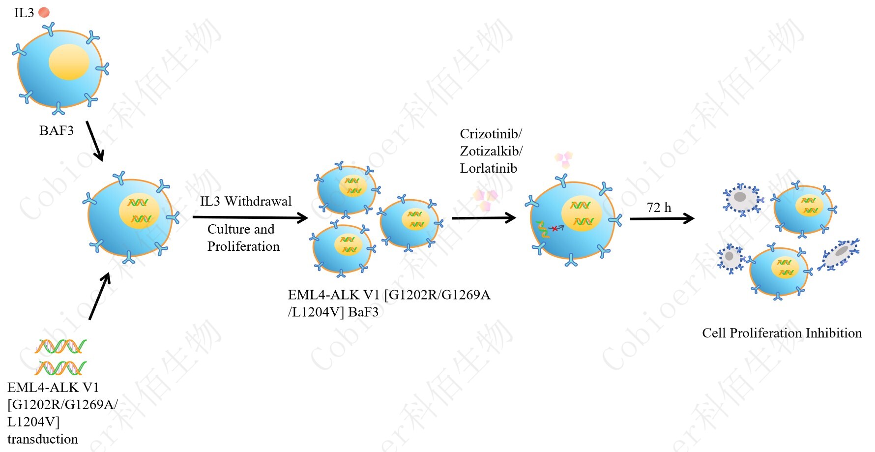 BaF3(小鼠原 B 細胞)的生長和增殖需要 IL-3 的維持。通過引入各種表達激酶的基因, 能作為 BaF3 的驅(qū)動基因,讓 BaF3 不再依賴 IL-3 而增殖,進而激酶基因成為 BaF3 增殖依 賴的驅(qū)動基因,用于評估小分子藥物對激酶的靶向抑制作用,原理及流程見下圖所示。