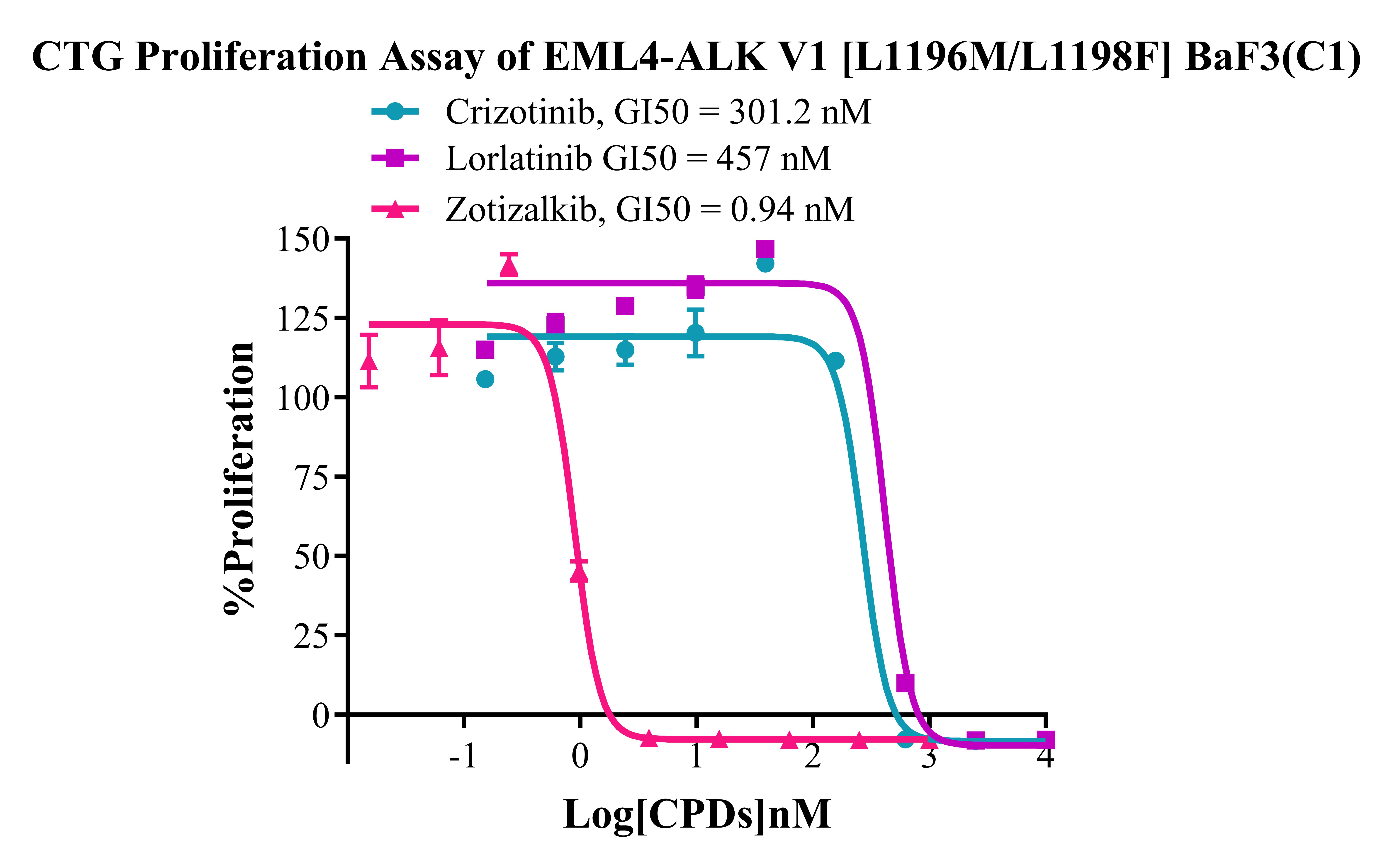 Figure 4. CTG Proliferation Assay of EML4-ALK V1 [L1196M/L1198F] BaF3(C1).  |
