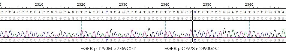Figure 2. Sanger of EGFR p.T790M c.2369C>T、EGFR p.C797S c.2390G>C
