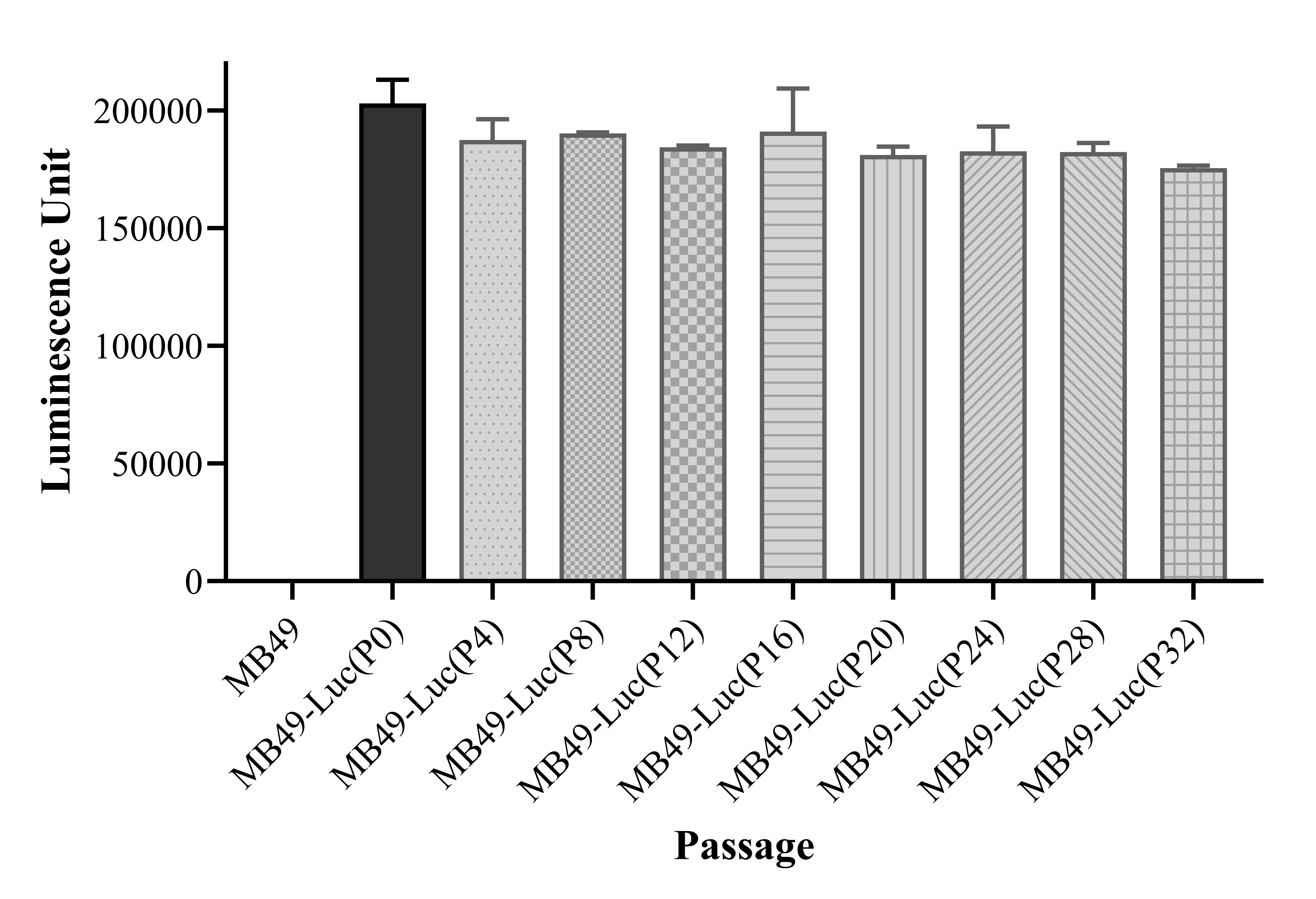 Figure 1. Stablity test results. MB49-Luc showed at least 32 passage stability with similar luminescence unit.  |