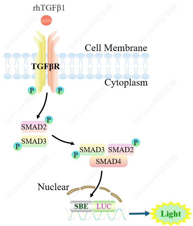 SBE-Luc HEK293 報告基因細胞,是由 SBE 調(diào)控并表達 Luc 熒光素酶報 告基因的 HEK293 細胞。TGF-β與受體結(jié)合,激活 SBE 的原理見下圖所示。![]() Figure 1. SRE-Luc HEK293 細胞模型原理圖  |