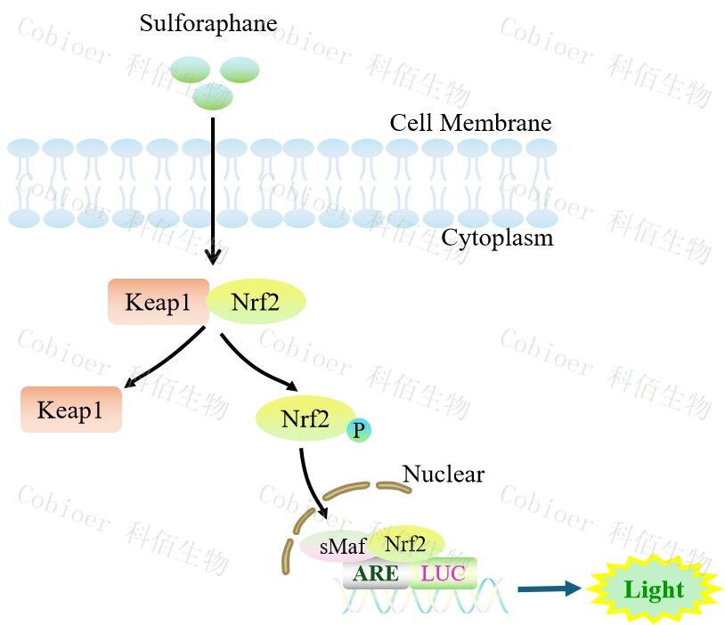 ARE-Luc(Nrf2 Antioxidant Pathway) HEK293 報告基因細胞,是由 ARE 調控并表達 Luc 熒光素酶報告基因的 HEK293 細胞。Sulforaphane 是 Keap1/Nrf2/ARE 的誘 導劑,原理見下圖所示。![]() Figure 1. ARE-Luc(Nrf2 Antioxidant Pathway) HEK293 細胞模型原理圖