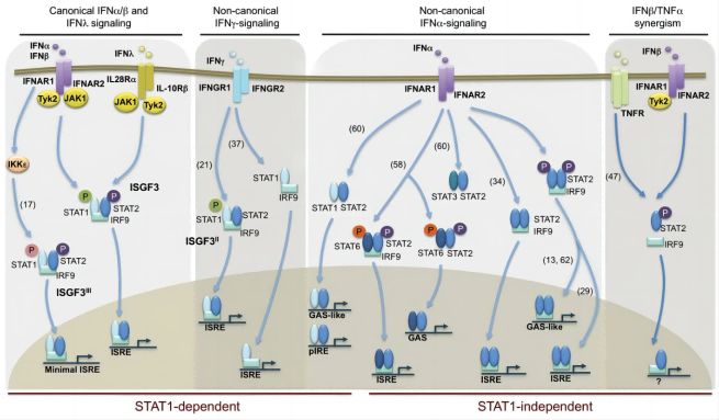 | Description: | pISGF3G.48 RE-Luc is designed for monitoring the induction of STAT1::STAT2::IRF9.IRF9 Transcription factor that mediates signaling by type I IFNs (IFN-alpha and IFN-beta). Following type I IFN binding to cell surface receptors, Jak kinases (TYK2 and JAK1) are activated, leading to tyrosine phosphorylation of STAT1 and STAT2. IRF9/ISGF3G associates with the phosphorylated STAT1:STAT2 dimer to form a complex termed ISGF3 transcription factor, that enters the nucleus. ISGF3 binds to the IFN stimulated response element (ISRE) to activate the transcription of interferon stimulated genes, which drive the cell in an antiviral state. Belongs to the IRF family. |