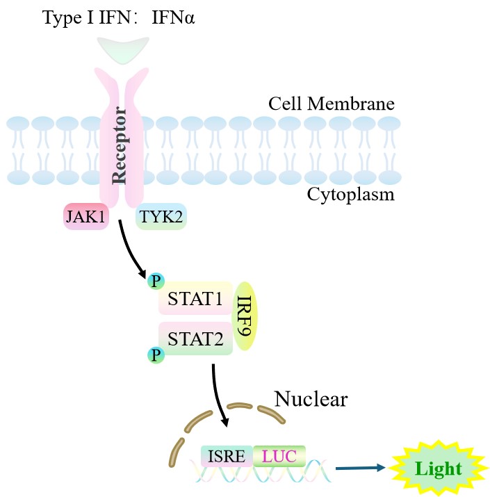 ISRE-Luc HEK293 報(bào)告基因細(xì)胞是由 ISRE 調(diào)控并表達(dá) Luc 熒光素酶 報(bào)告基因的 HEK293 細(xì)胞。IFN 與受體結(jié)合,激活 ISRE 的原理見(jiàn)下圖所示。