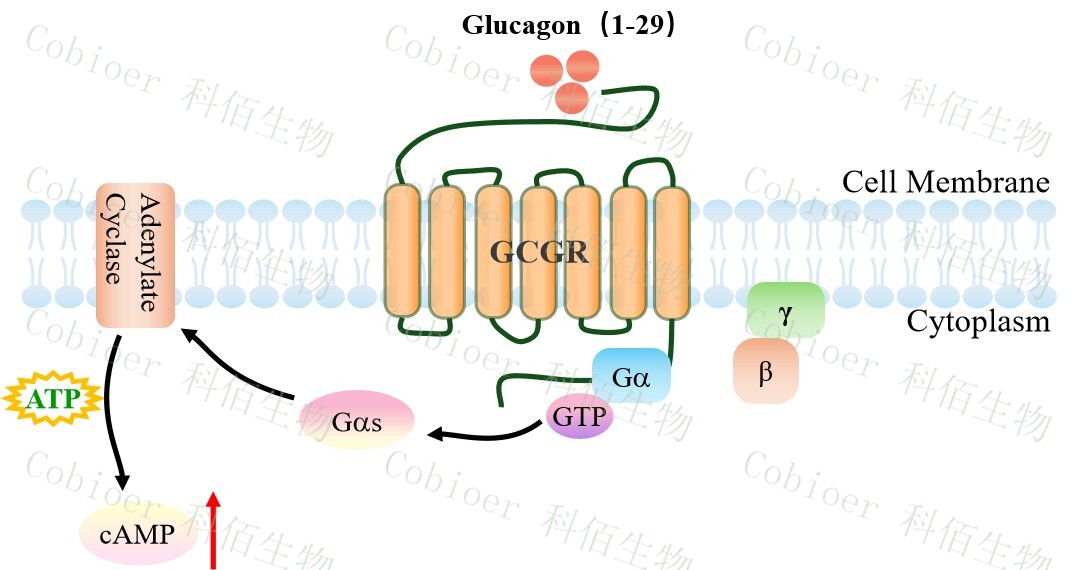 cAMP 在 G 蛋白偶聯(lián)受體(GPCR)信號轉(zhuǎn)導(dǎo)中是一種關(guān)鍵的第二信使。當(dāng)配體結(jié)合到 GPCR,構(gòu)象發(fā)生變化,激活受體接著激活 G 蛋白,Gs 的激活導(dǎo)致腺苷酸環(huán)化酶調(diào)控 cAMP 的升高。GCGR CHO 藥靶模型很好的模擬了體內(nèi) GCGR 的信號轉(zhuǎn)導(dǎo)過程,原理見下圖所示。