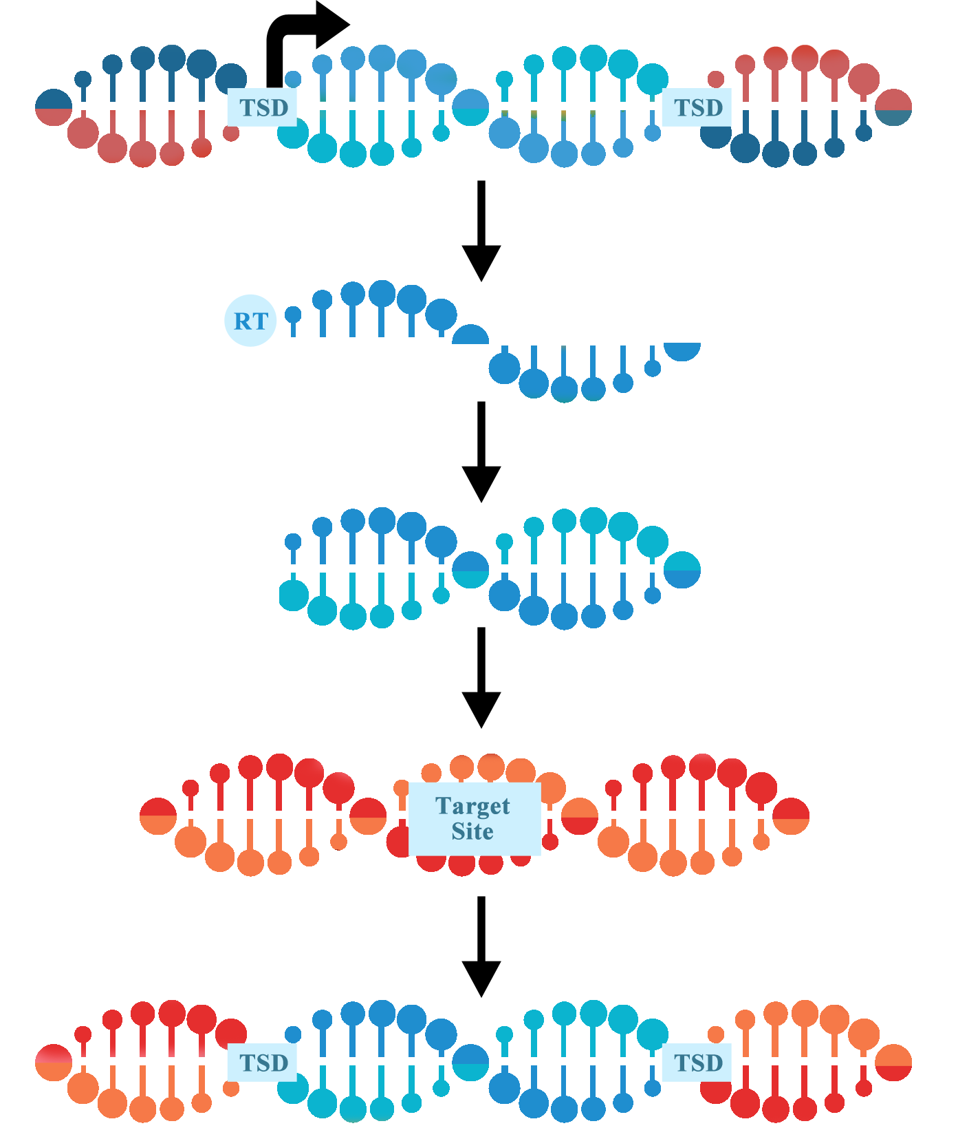 圖 1:逆轉(zhuǎn)錄轉(zhuǎn)座子轉(zhuǎn)座概述。逆轉(zhuǎn)錄轉(zhuǎn)座子通過“復(fù)制粘貼Ctrl C+V”機(jī)制進(jìn)行移動。