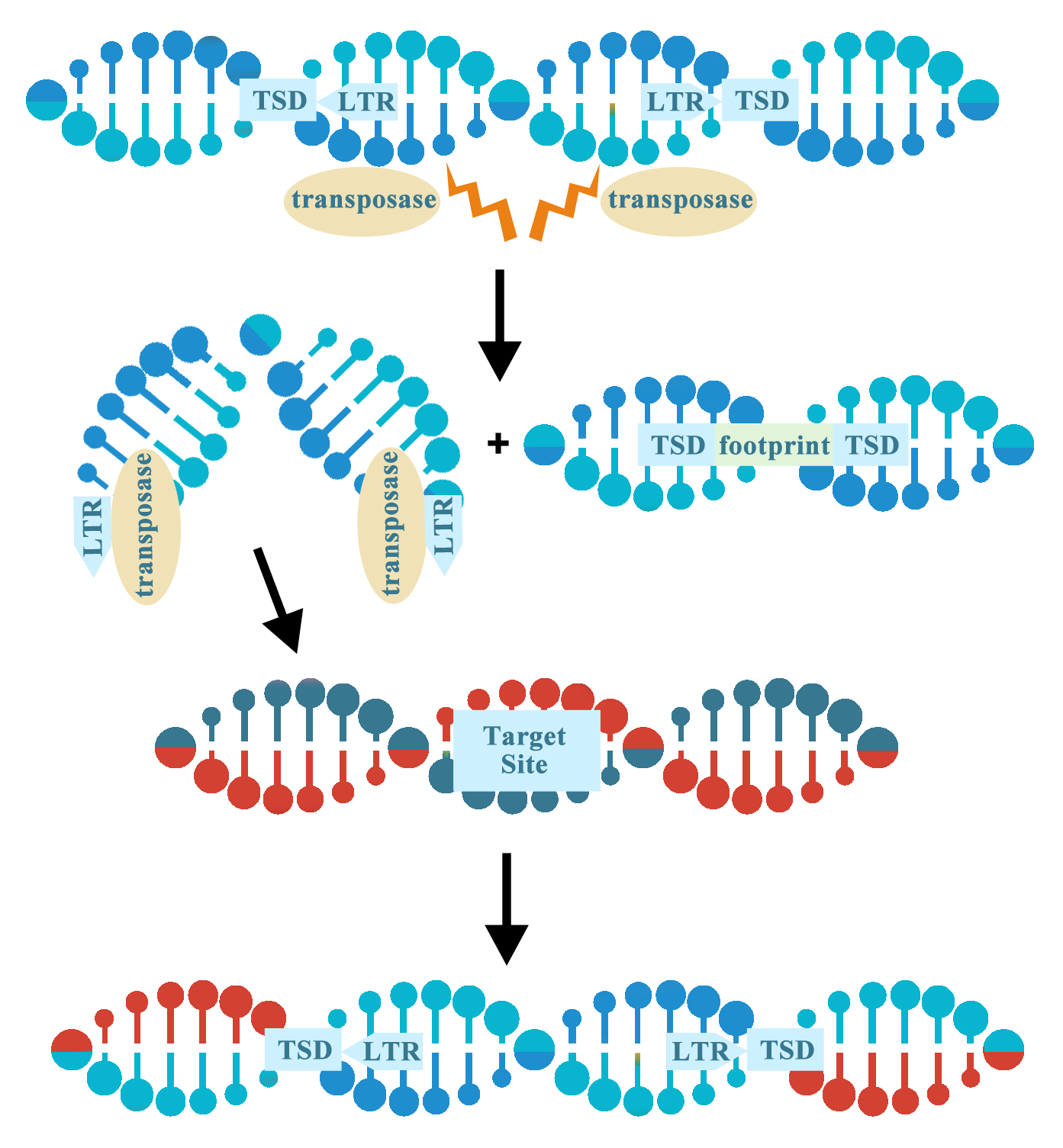 雖然轉(zhuǎn)座子有很多不同的類型,但DNA轉(zhuǎn)座子在實(shí)驗(yàn)室中用于基因組操作最為常見。在實(shí)驗(yàn)室中使用轉(zhuǎn)座子時,轉(zhuǎn)座酶基因以反式形式提供,以便將目標(biāo)基因插入轉(zhuǎn)座子的長末端重復(fù)序列(LTR)之間,類似于病毒載體的包裝過程。